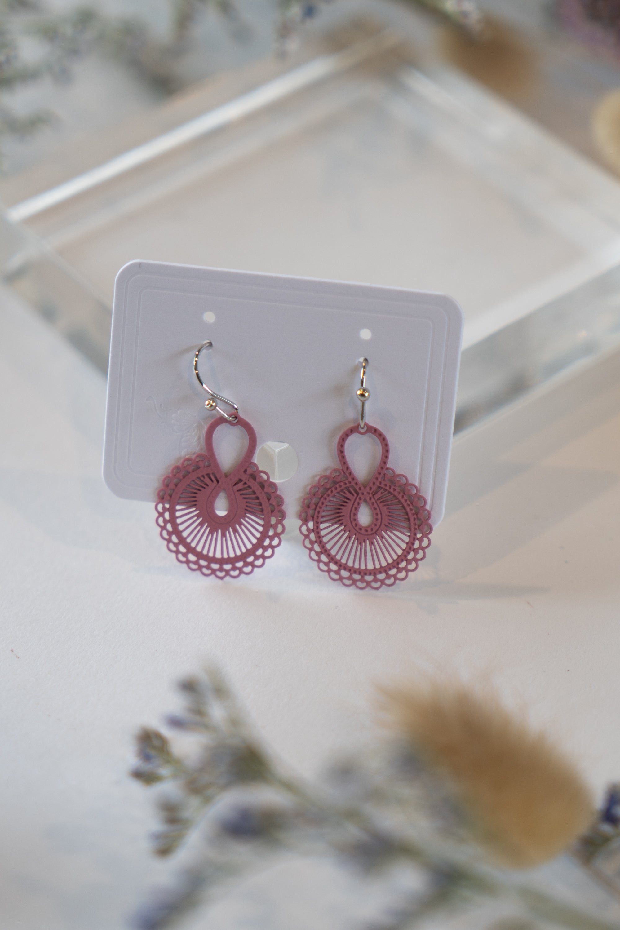 These fine mesh earrings come in a beautiful array of color options, offering a delicate and lightweight design. This option is a spiral and bordered pattern design. A perfect small accessory to add a subtle touch of elegance to any outfit.
