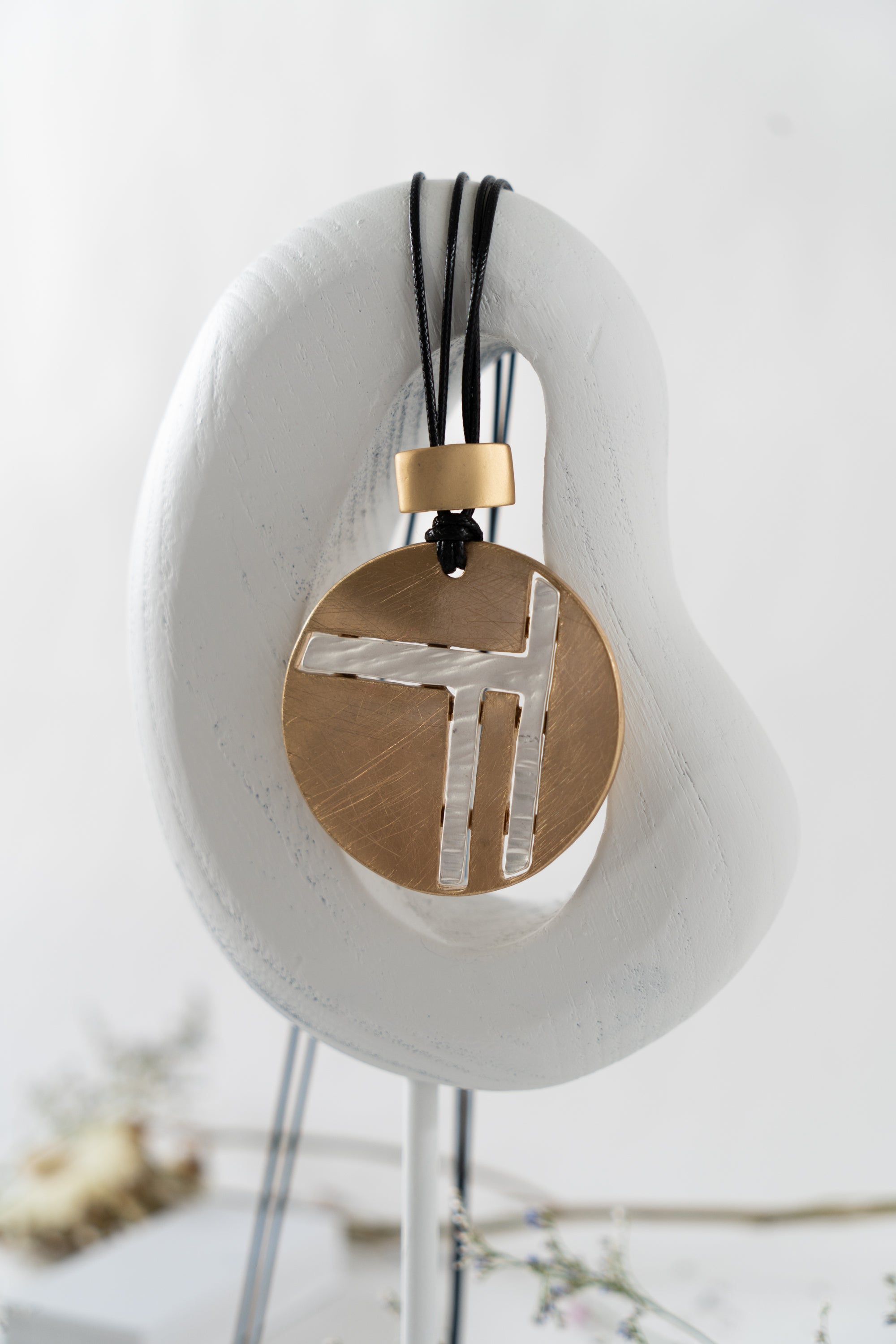This bold statement necklace is available in two striking color options. One features a matte brushed gold medallion with an "F" for Funky in brushed silver, while the other showcases a matte brushed silver medallion with the "F" in brushed gold. Both options hang from a black double cord and offer an additional 7 cm of extension for adjustable length, making them a versatile and stylish choice. Photo to come of second option.