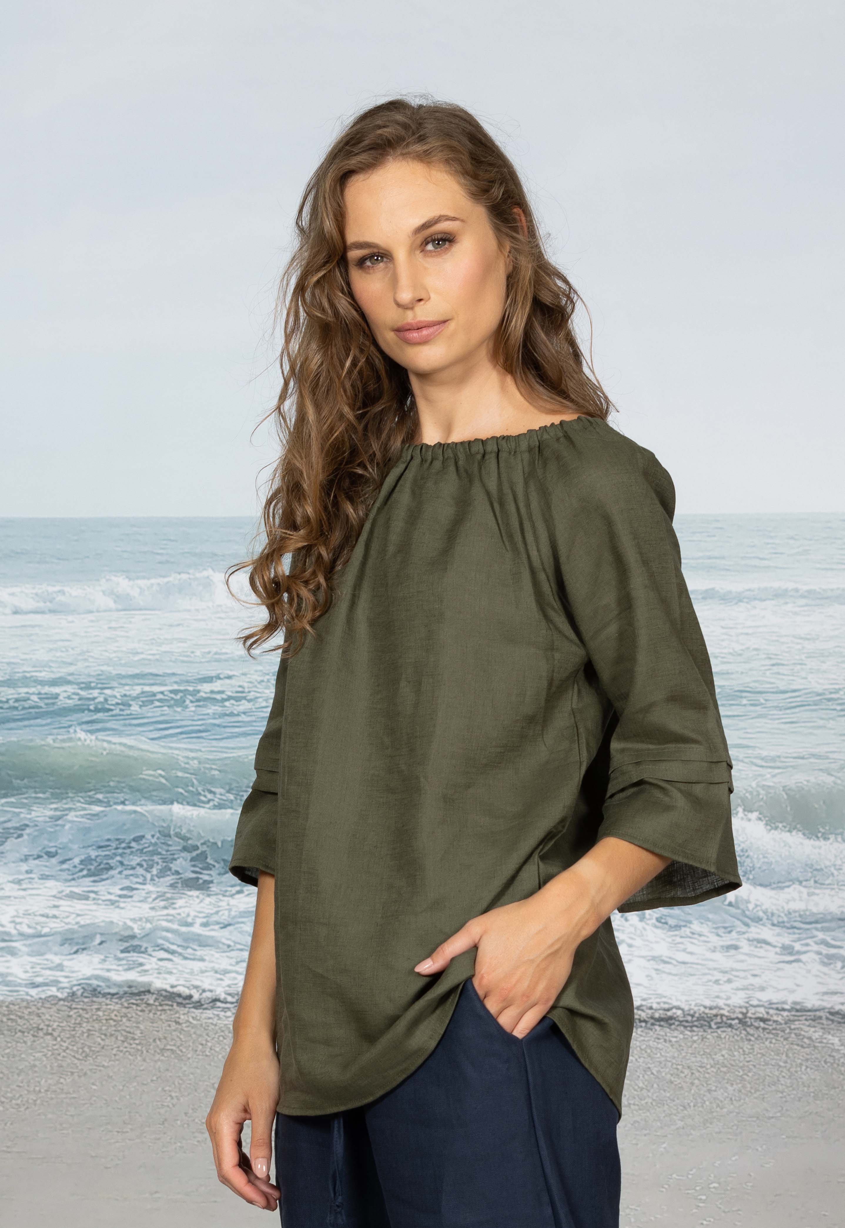 This gathered boat neck top is a versatile and stylish addition to any wardrobe, available in an array of colorways including classic plains, subtle pinstripes, ginghams and a charming floral print. Designed to be worn either on or off the shoulder, it offers a playful yet elegant silhouette, perfect for any occasion. The 3/4 sleeves are adorned with delicate double pintucks, adding a touch of sophistication to the relaxed fit. Whether paired with linen pants for a laid-back look or dressed up for an evening out, this top is a beautifully adaptable piece that transitions effortlessly from day to night.
