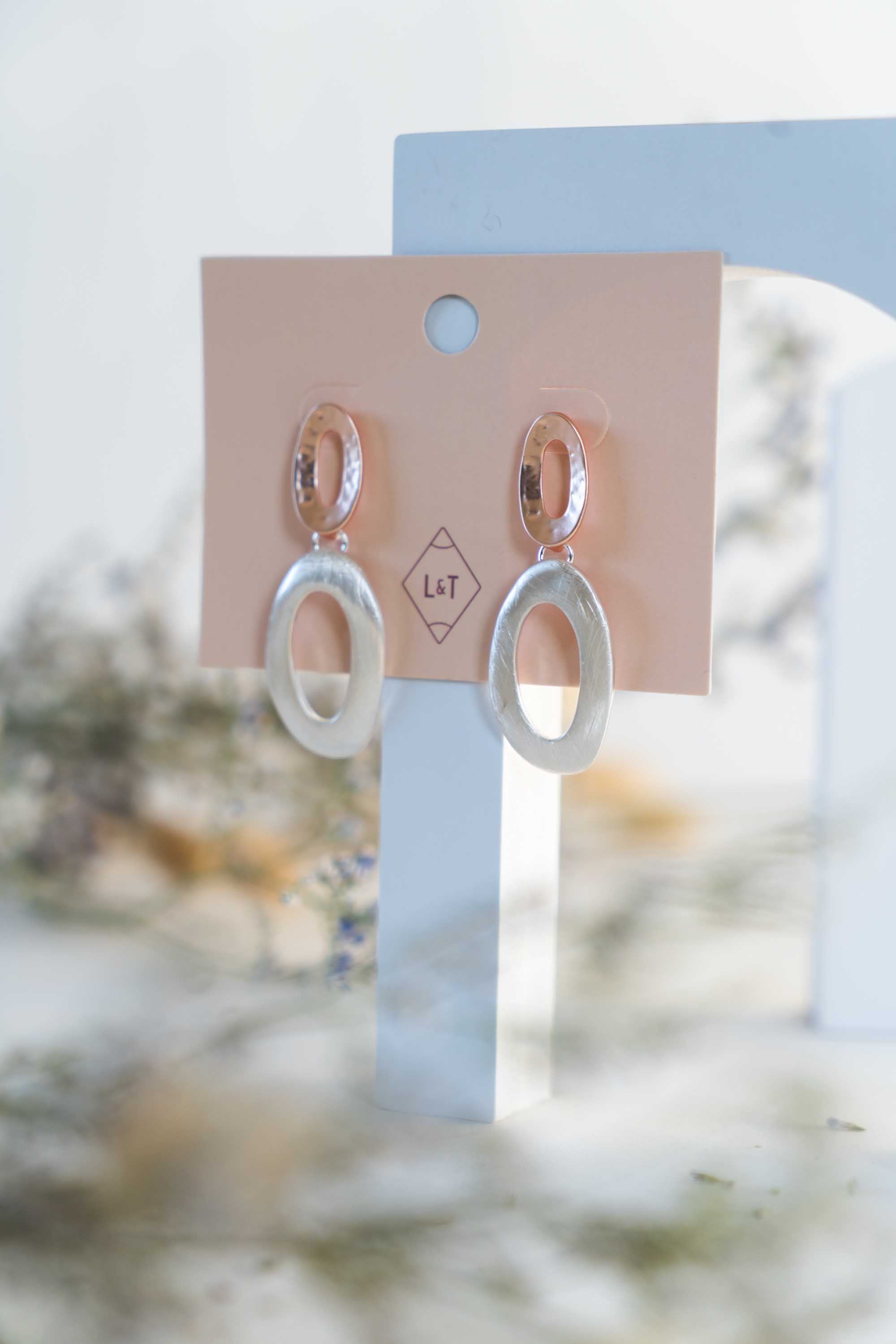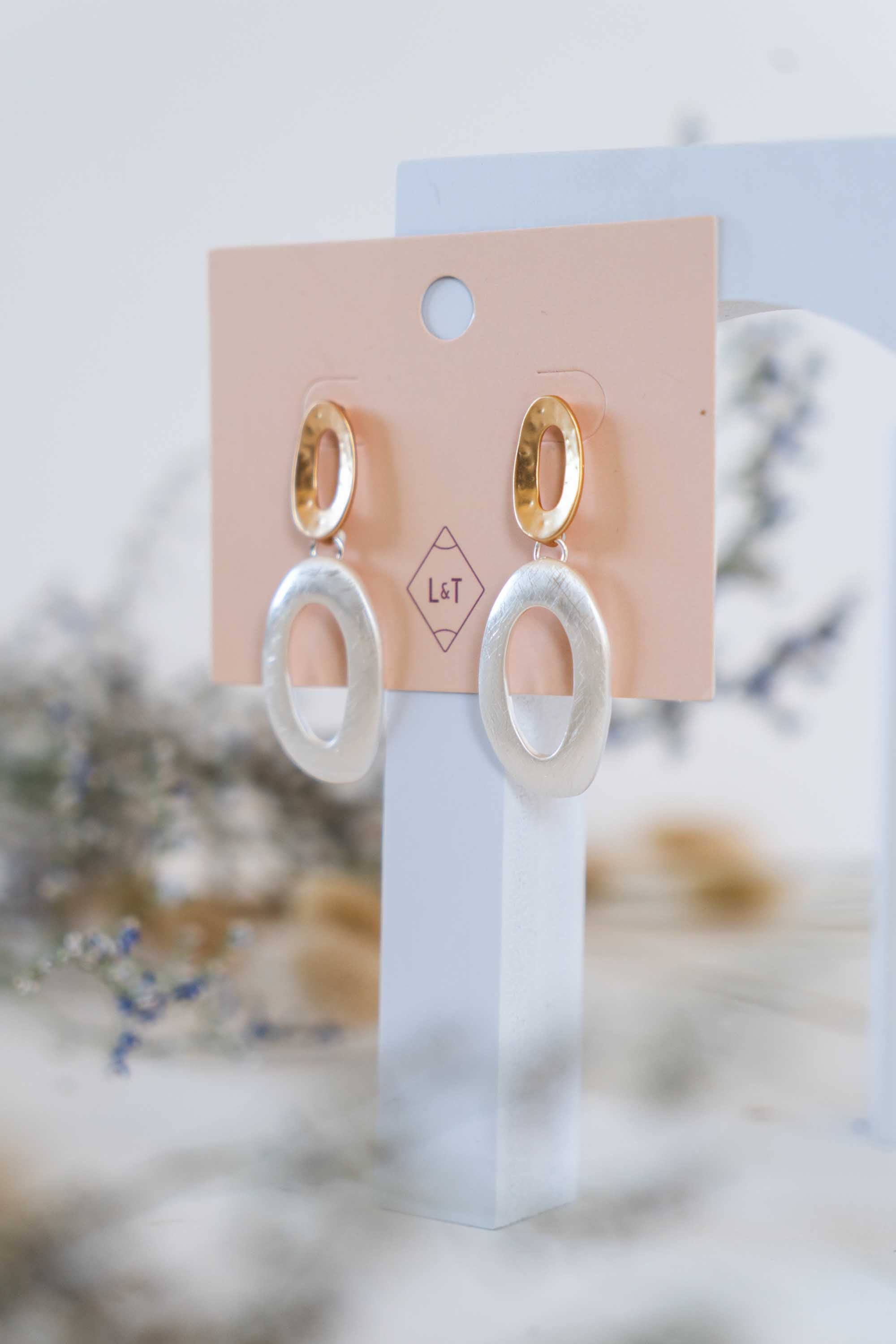 These elegant earrings feature a matte oval disc at the post, available in a choice of gold or rose gold, leading to a larger oval at the bottom in silver. The understated matte metal finish adds a touch of modern sophistication, making them a versatile addition to any jewelry collection.
