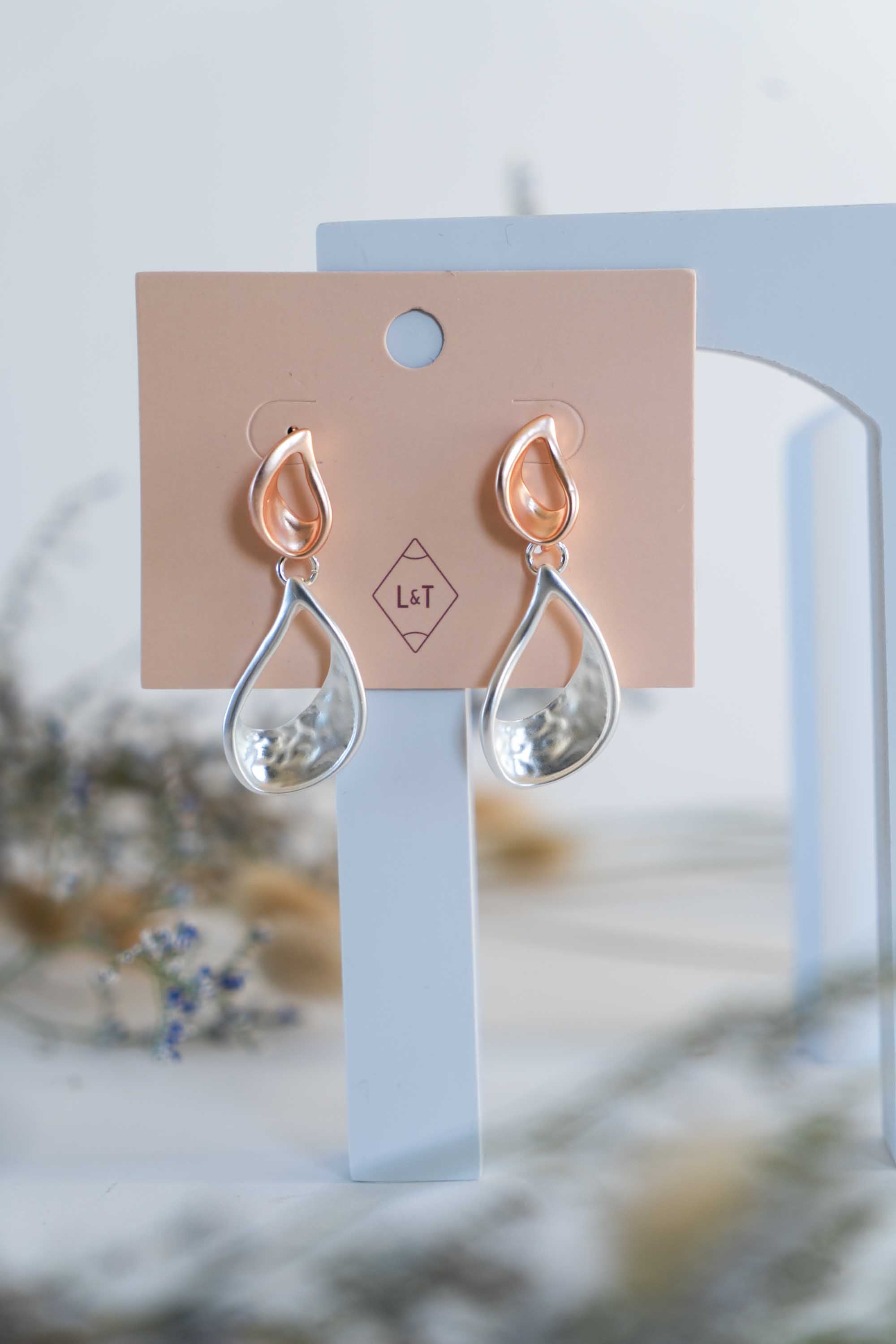 These elegant earrings feature a twisted matte rose gold attachment at the post, leading to a larger twisted oval at the bottom in matte silver. The understated matte metal finish adds a touch of modern sophistication, making them a versatile addition to any jewelry collection.