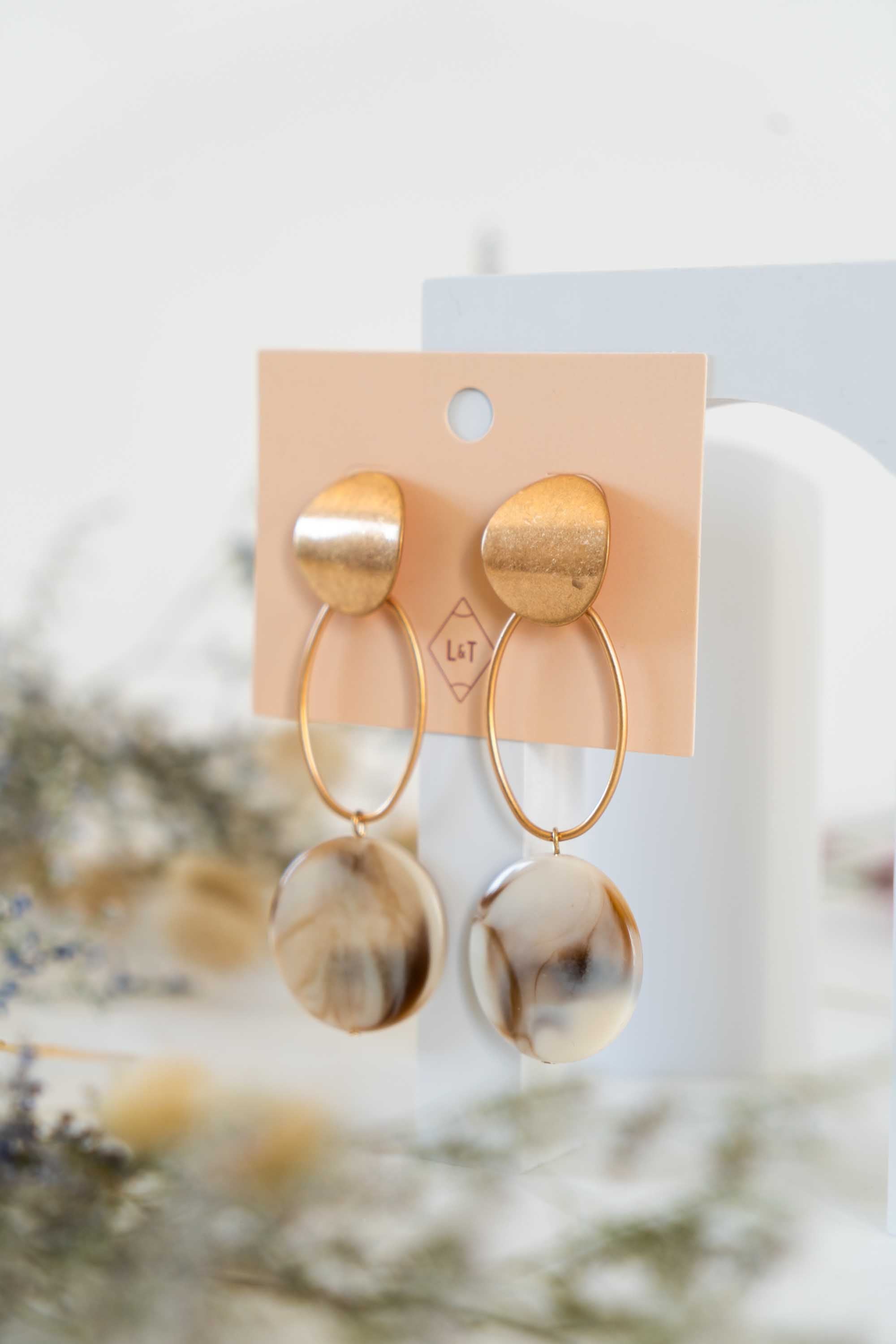 These gold and resin dangle earrings are the perfect statement piece, balancing bold design with neutral tones. A soft gold disc elegantly covers the post, leading to an elongated loop that gracefully descends. The resin discs at the bottom feature a captivating swirl of cream to deep beige, evoking a natural, earthy aesthetic. These earrings exude a refined yet organic charm, making them an exquisite addition to any outfit.