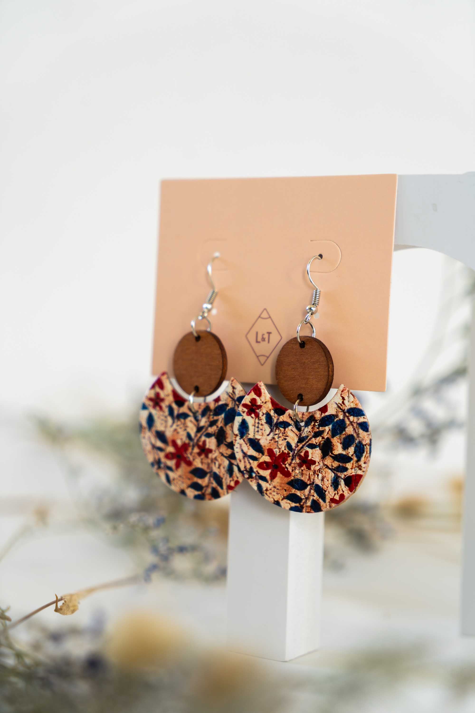 These lightweight cork earrings feature light wooden buttons at the top, creating a stylish and versatile accessory. They pair beautifully with navy, making them a great basic addition to your jewelry collection.