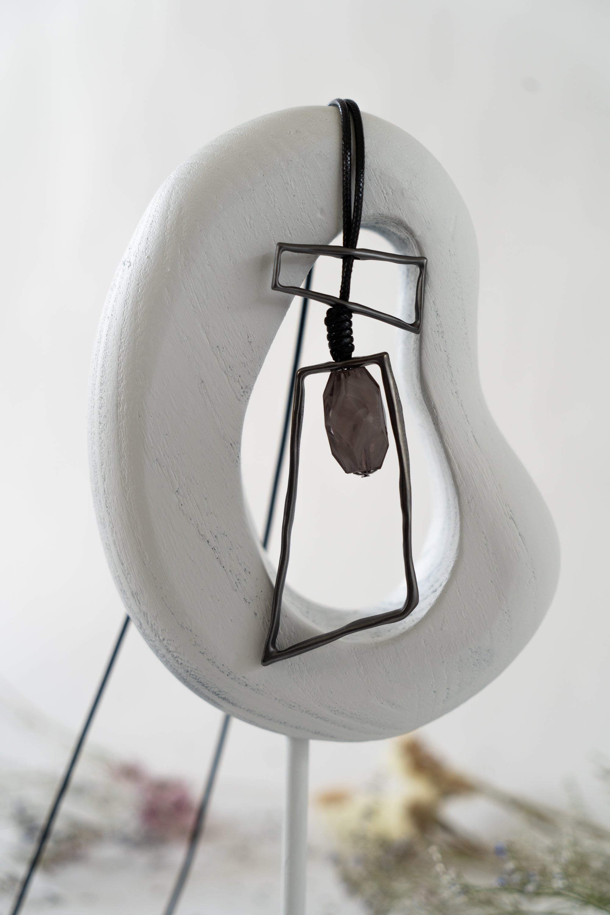 This eye-catching piece features striking gunmetal triangles paired with a sparkling crystal droplet, creating a bold yet versatile design. Perfect for both daywear and evening wear, the pendant is suspended from a sleek black cord, which can be adjusted to extend by an additional 7cm for the ideal fit. The combination of edgy gunmetal and the delicate crystal makes this accessory a standout choice for any occasion.