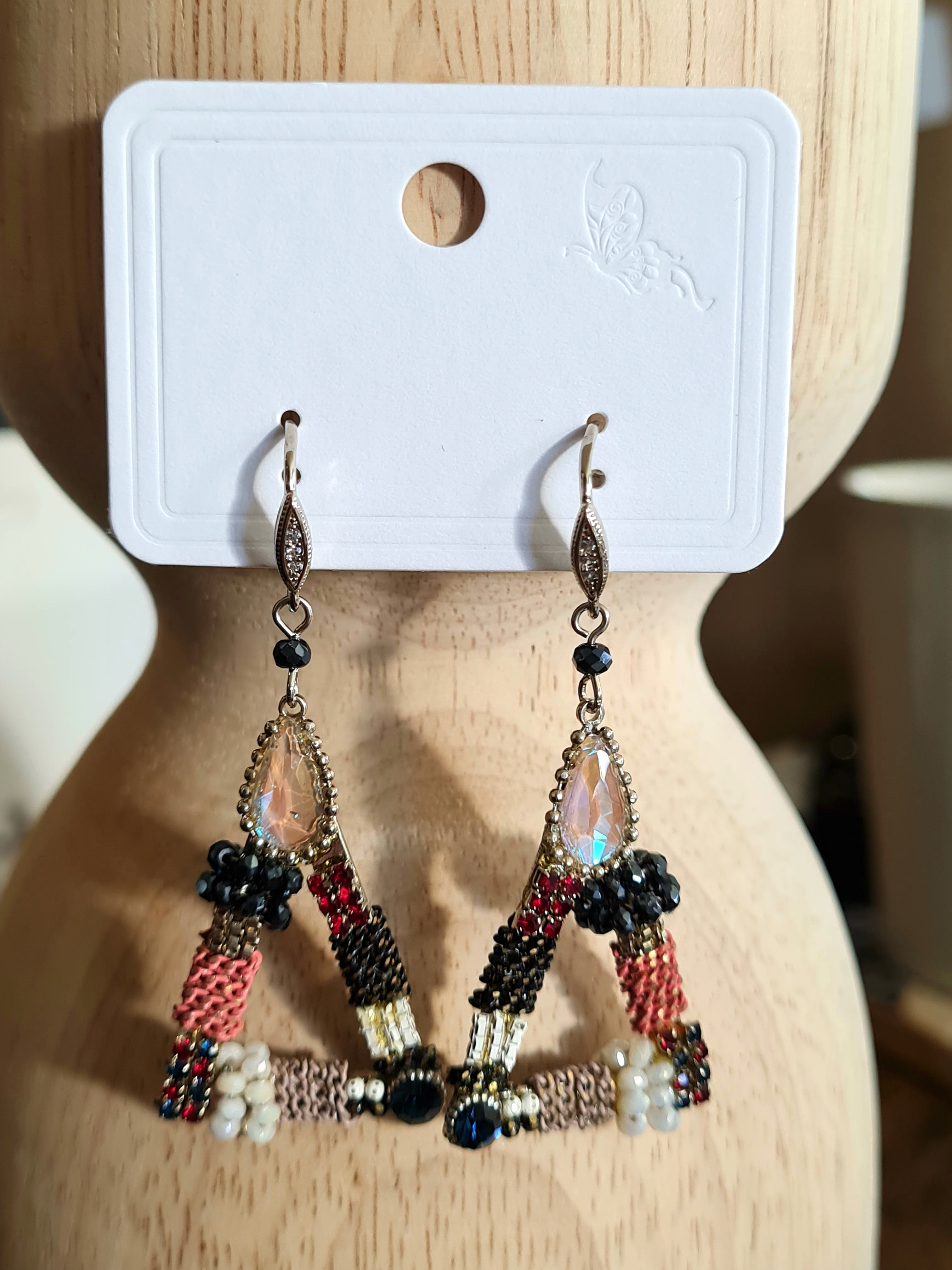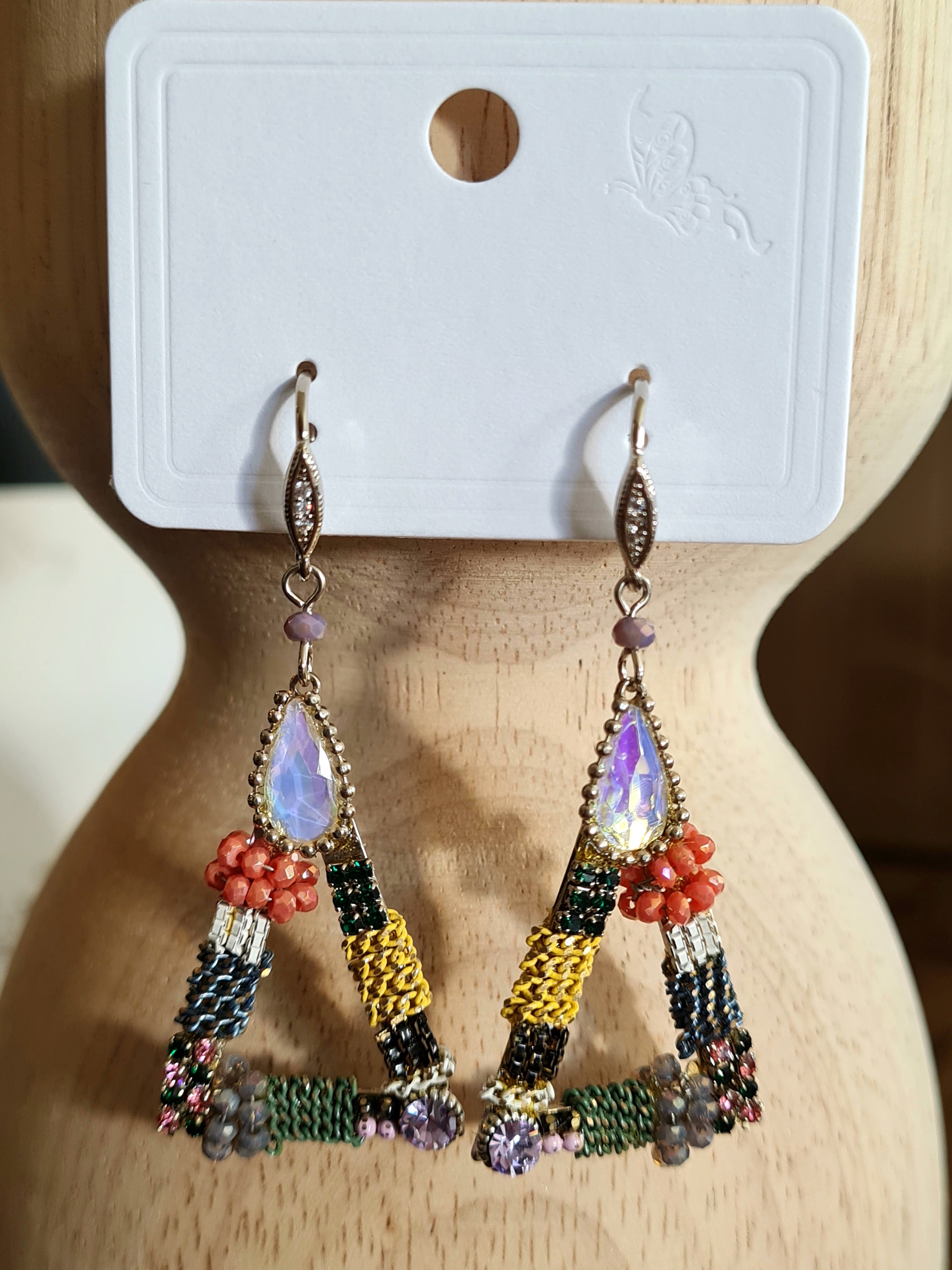 Bold and unique, these handmade earrings feature a geometric triangle design crafted from red-toned beads, sparkling crystals, tiny white pearl beads and deep black accents with a blue feature crystal in the bottom corner. Lightweight and eye-catching, they blend artisanal detail with modern style—perfect for adding a statement touch to any outfit. The same design in a second option is made up of peach beads, greens and yellows - an earthy option with tiny peach crystals and a lavender crystal feature stone in the bottom corner