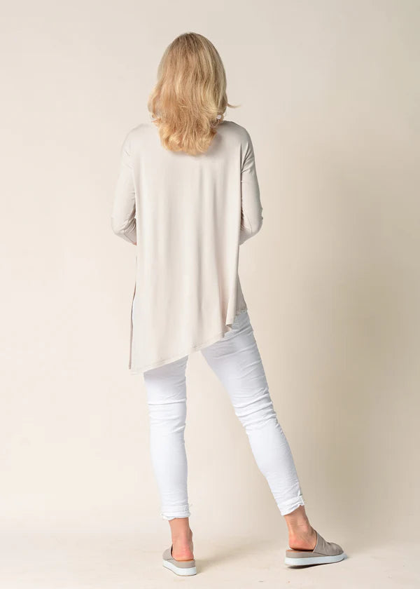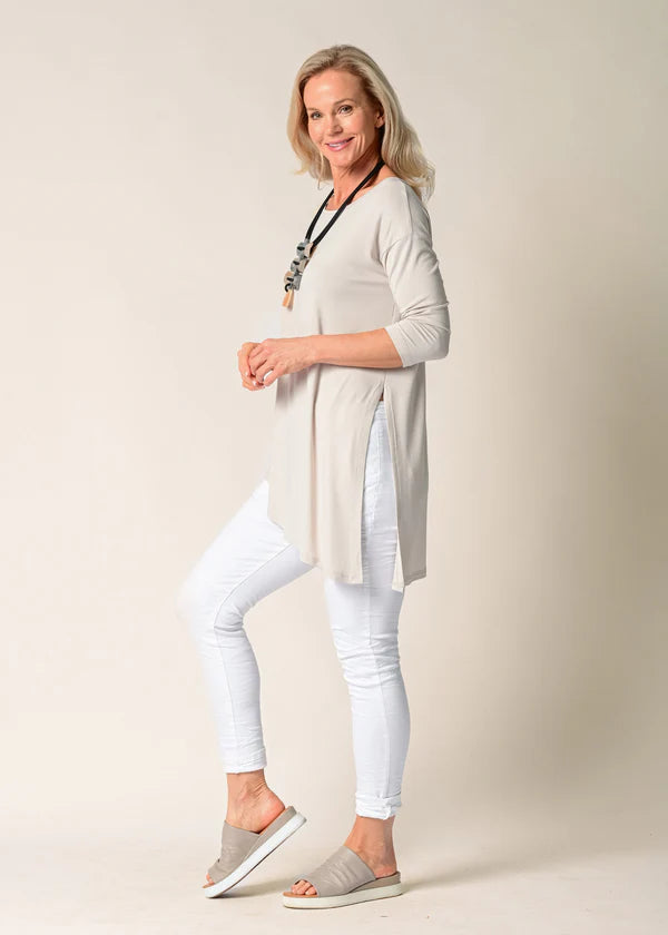 This versatile top features a classic round neck and 3/4 length sleeves for a timeless look. The asymmetrical hem adds a modern twist, with a stylish side split on the longer side for extra flair. Made from 96% viscose which is derived from natural fibres, and 4% spandex, it offers a soft and comfortable fit with just the right amount of stretch. Perfect for pairing with jeans, shorts, or tights for a casual vibe, or easily elevated with some jewellery for a more polished look.