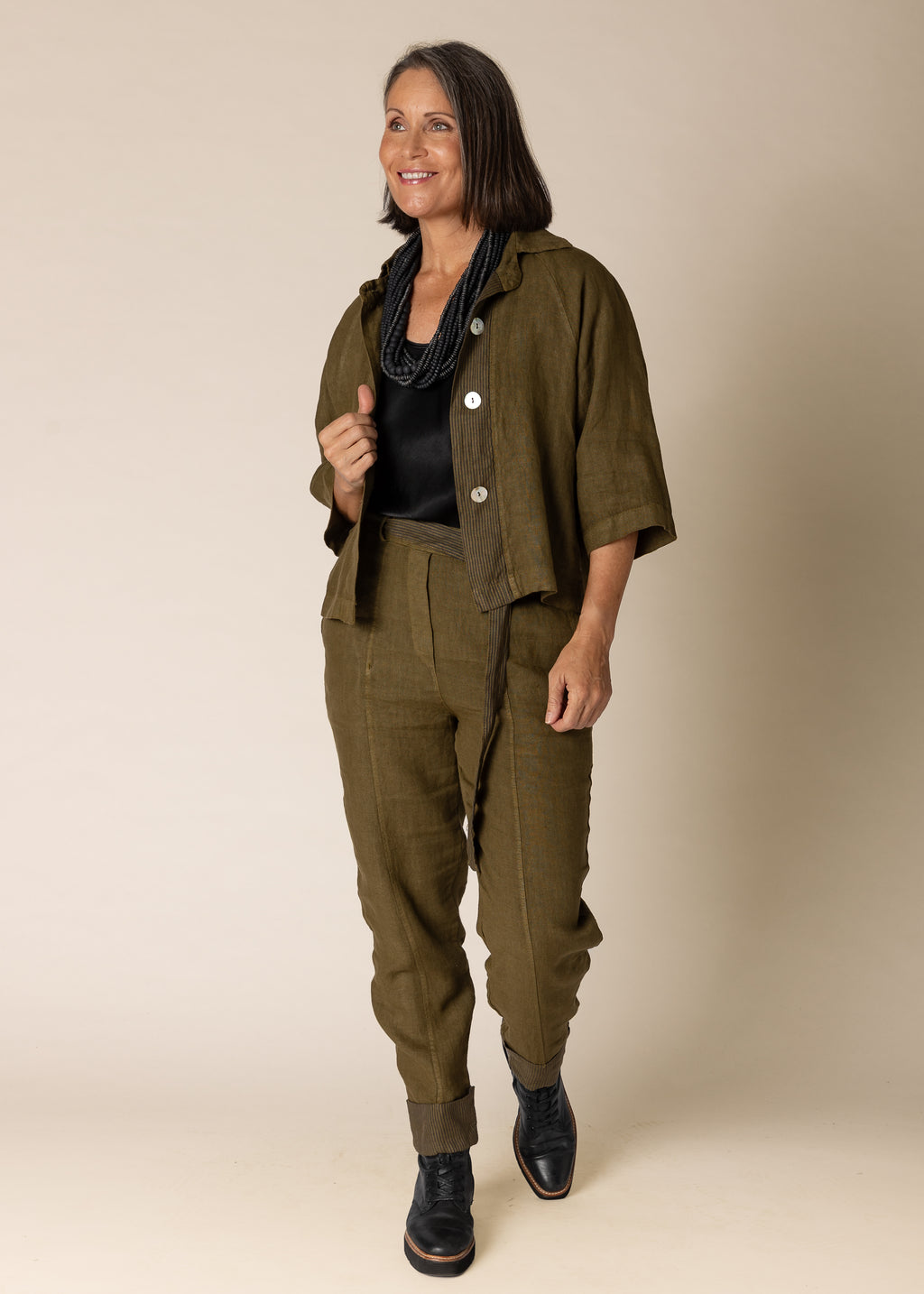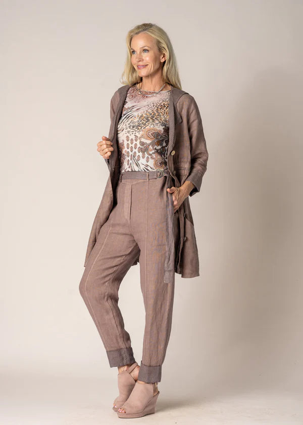 The Helena Linen Pants have a flat front band with a false fly and an elasticated back band for comfort. A striped fixed belt with a statement D buckle adds style, while side and back pockets offer practicality. The top-stitched tapered legs are finished with a distinctive striped cuff.