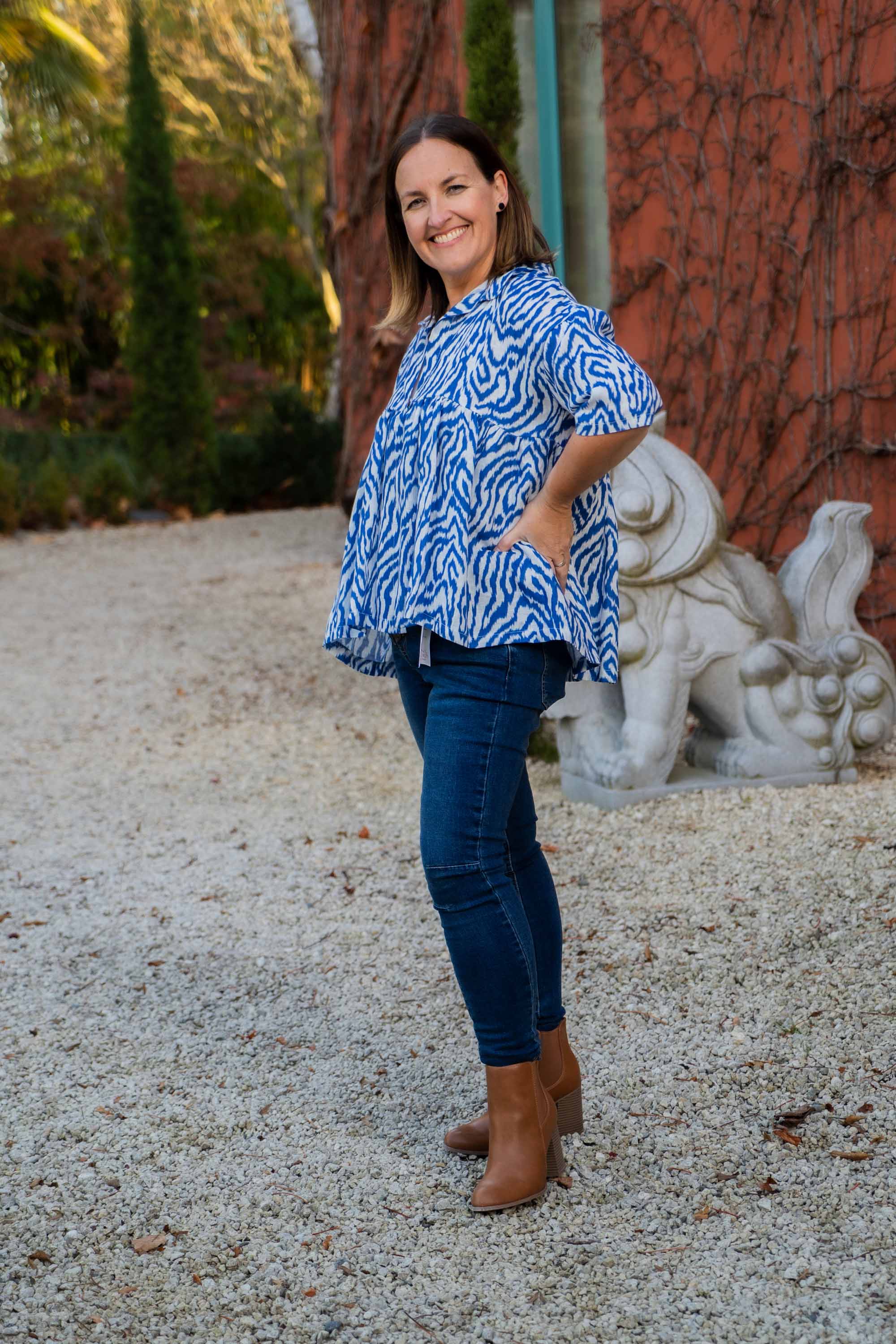 Introducing our charming addition to the jazzy print collection, the little ruffled crop top. Featuring short, dropped-style sleeves and a playful ruffled skirt both front and back, this top is designed to make a statement. The front ruffle is elegantly open but can be fastened with a coconut shell button at the top of the frill, adding a touch of bohemian charm. Its lapel-style neckline enhances its chic appeal, making it a versatile piece that can be layered over a white top or t-shirt. Pair it effortlessly with white pants for a fresh, summery look, or mix and match with any of our jeans for a stylish ensemble that's ready for any occasion.