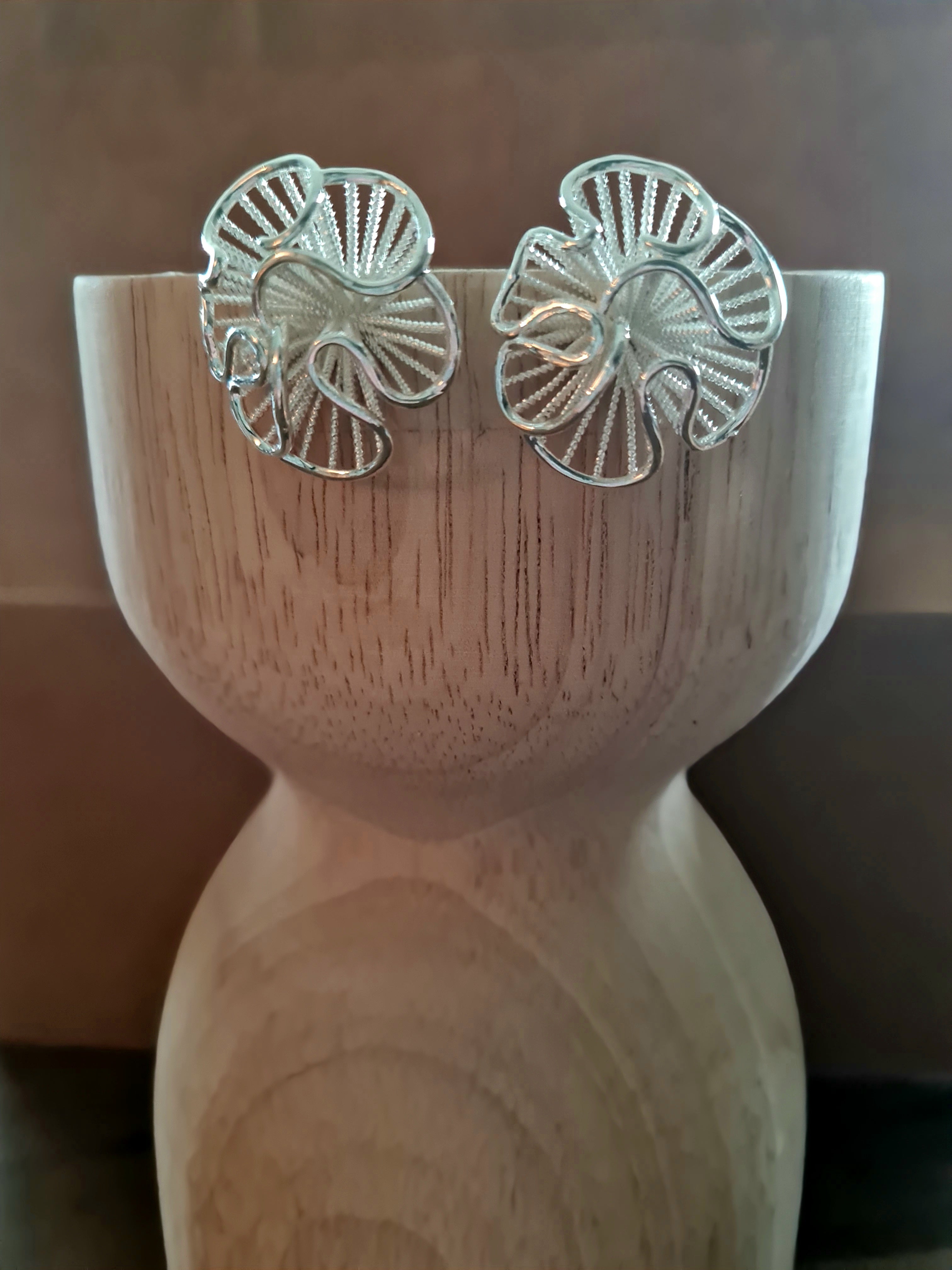 These elegant button-style studs feature a delicate, lace-like frill twist bordered in refined silver, creating a timeless silhouette full of subtle texture and grace. With their soft curves and intricate detailing, they evoke vintage charm while remaining perfectly modern. A stunning choice for the bride or a sophisticated wedding guest, these earrings offer effortless elegance in a compact, beautifully crafted form—simply gorgeous for your special day.