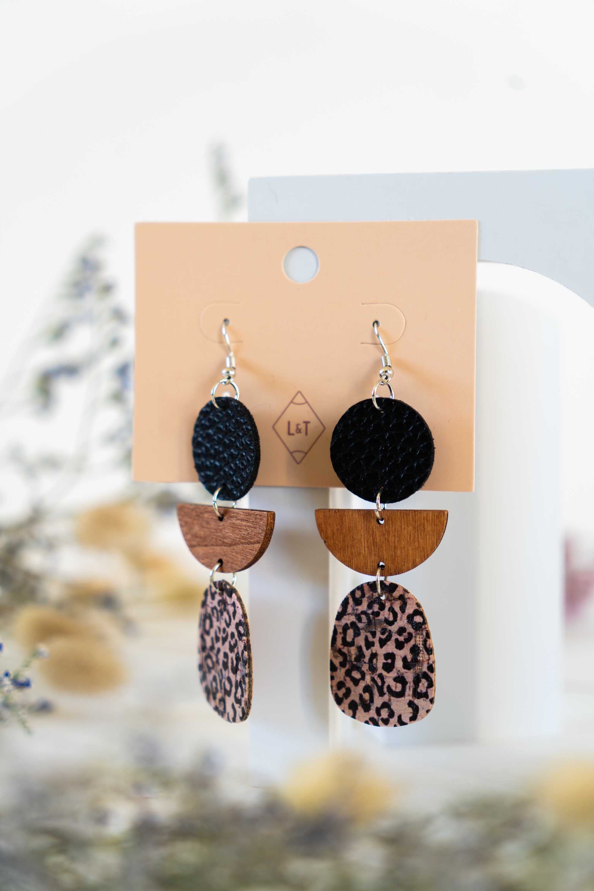 Made of leather, these earrings feature an animal print in black and taupe on the bottom and black leather at the top, with a crescent-shaped lightweight wooden piece in between. These catchy wee numbers are perfect for jazzing up any outfit.