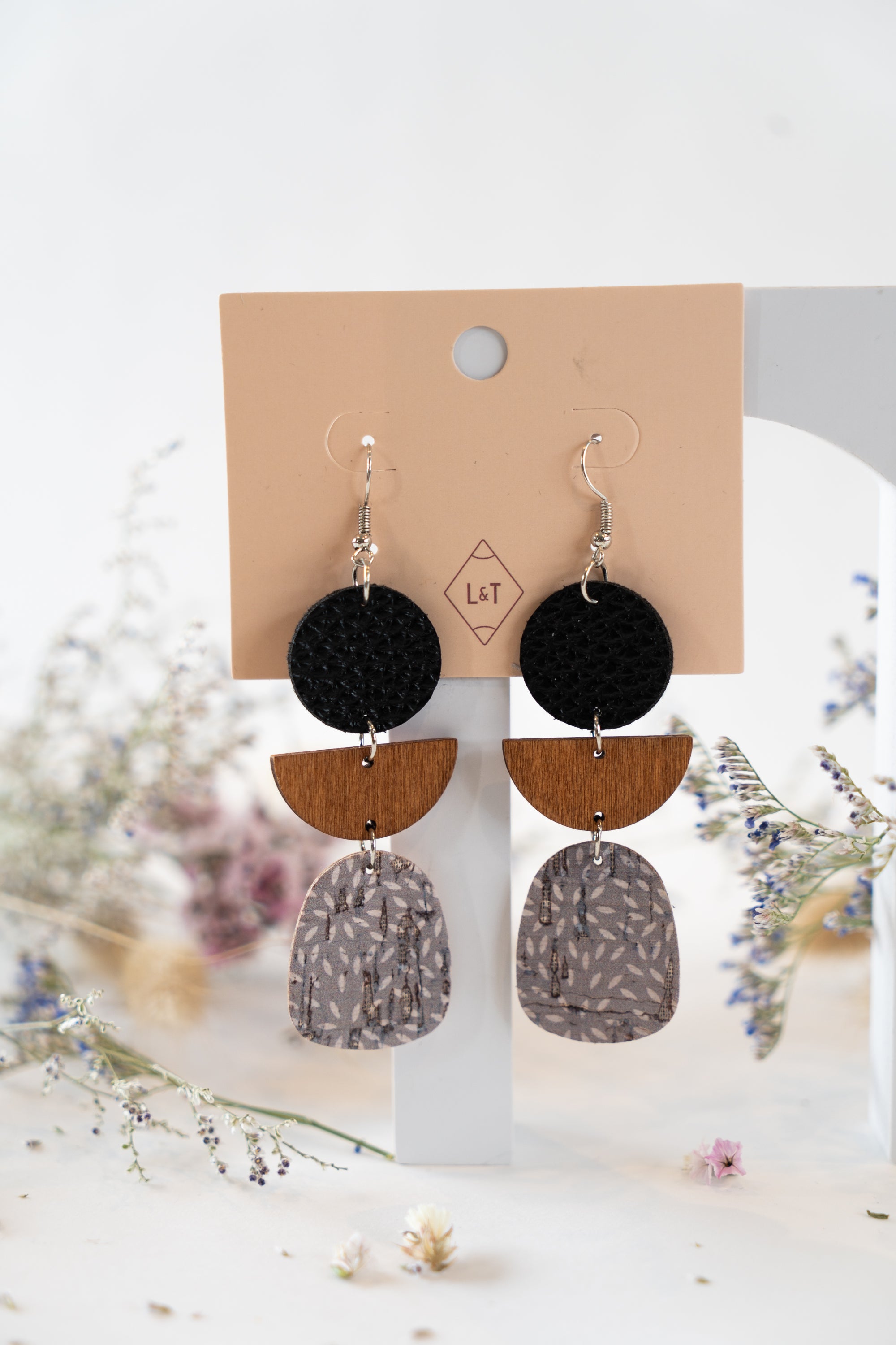 Made of leather, these earrings feature an animal print in grey and white on the bottom and black leather at the top, with a crescent-shaped lightweight wooden piece in between. These catchy wee numbers are perfect for jazzing up any outfit.