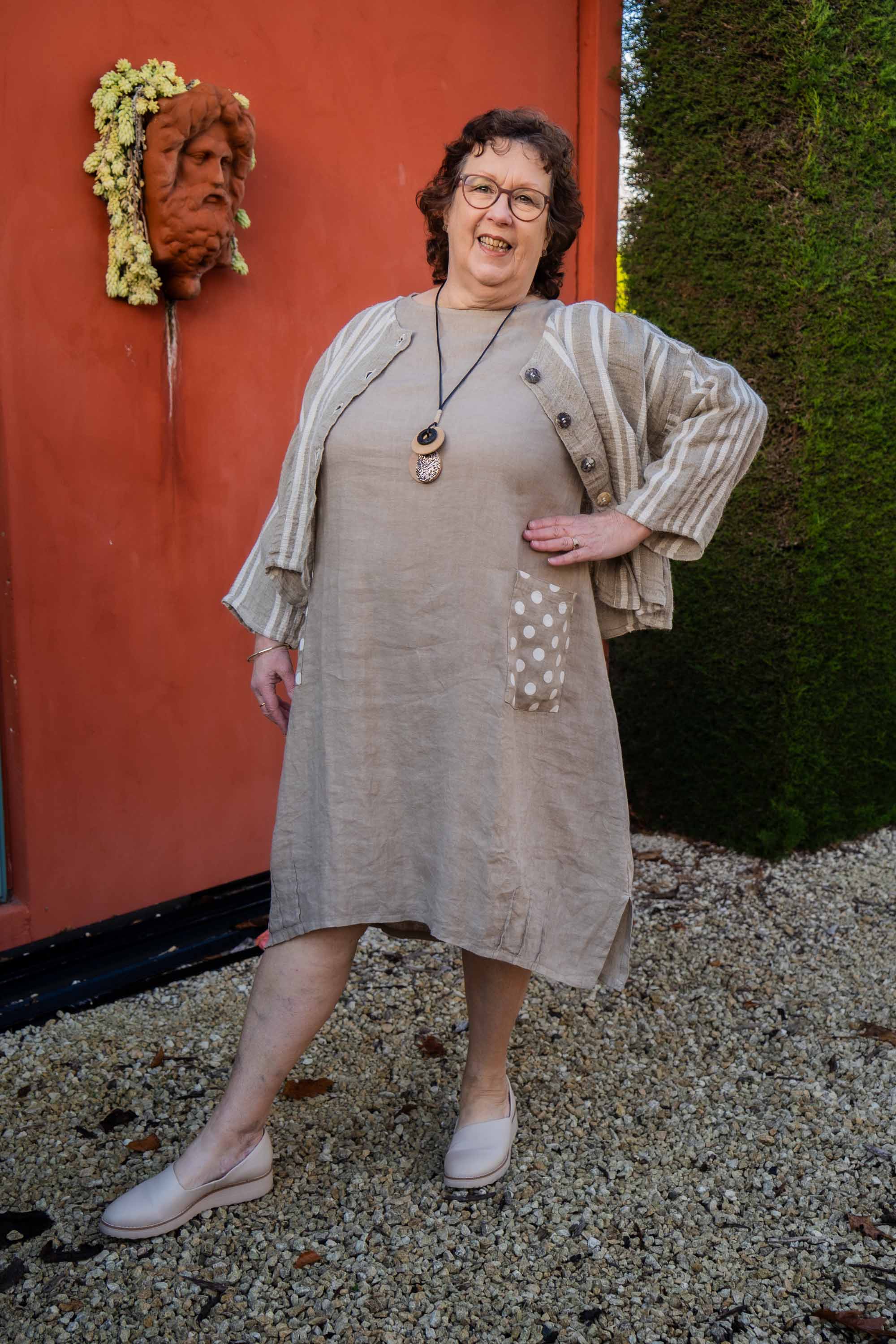 This Linen Dress features a charming A-line style with delightful polka dot patch pockets and three delicate pleats on each side of the front hemline and small side splits. The drop short sleeves add to its simple elegance, making it a perfect choice for any occasion. The dress is designed with subtle, refined details that enhance its timeless appeal. We've teamed it with a La Bottega di Brunella Crop Jacket in raw linen and a stripe pattern, but it can also be paired beautifully with one of our Linen Zip Front Crop Jackets or a Linen Duster Coat for a versatile and stylish ensemble.