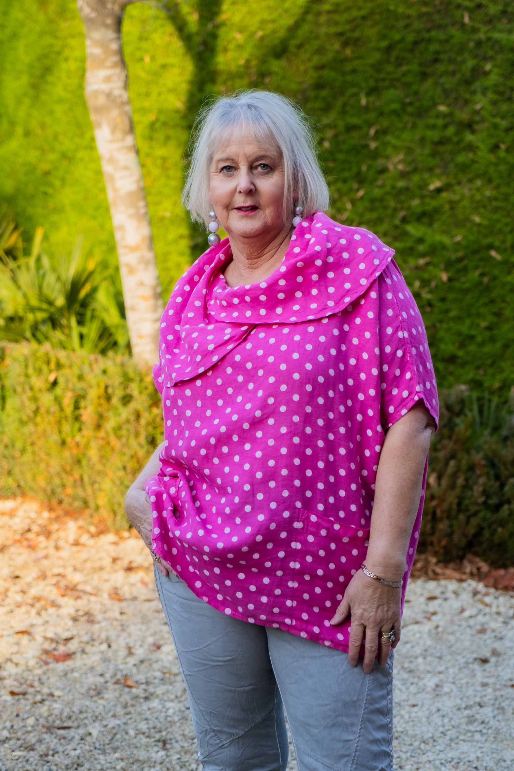 The Moku Top is designed with a shorter length that comfortably drapes over the hips, providing a flattering fit without being too short. This short-sleeved top features a stylish cowl neck and comes in a charming spotted linen print, perfect for adding a playful touch to your wardrobe. Ideal for the fuller figure, it ensures exceptional comfort while maintaining a chic and fashionable look. For those who prefer a different style, the Moku Top is also available in a gorgeous floral print, offering versatility and elegance in one beautiful piece. Teams beautifully with either our casual stretch pants or our comfortable Linen Penny Pants.