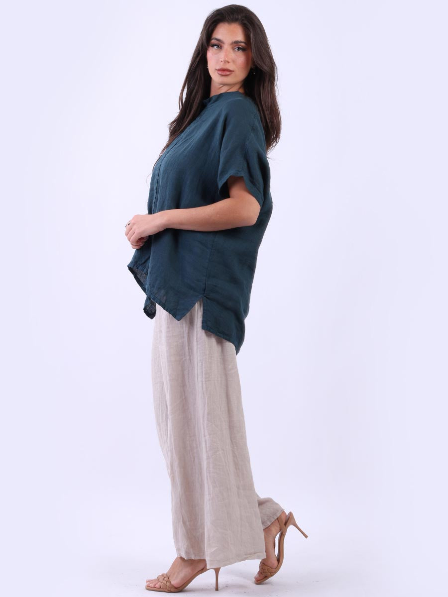 Designed for effortless elegance and comfort, this linen top is perfect for the fuller figure. The relaxed drop-sleeve design and generous length create a flattering, easy fit, while the perfectly plain finish ensures timeless versatility. Featuring a narrow cowl neckline, this effortlessly stylish piece is accented by a topstitched center-front panel, adding subtle detail. The unique uneven hemline at the front lends a modern touch, making it a wardrobe essential that pairs beautifully with both casual and elevated looks.