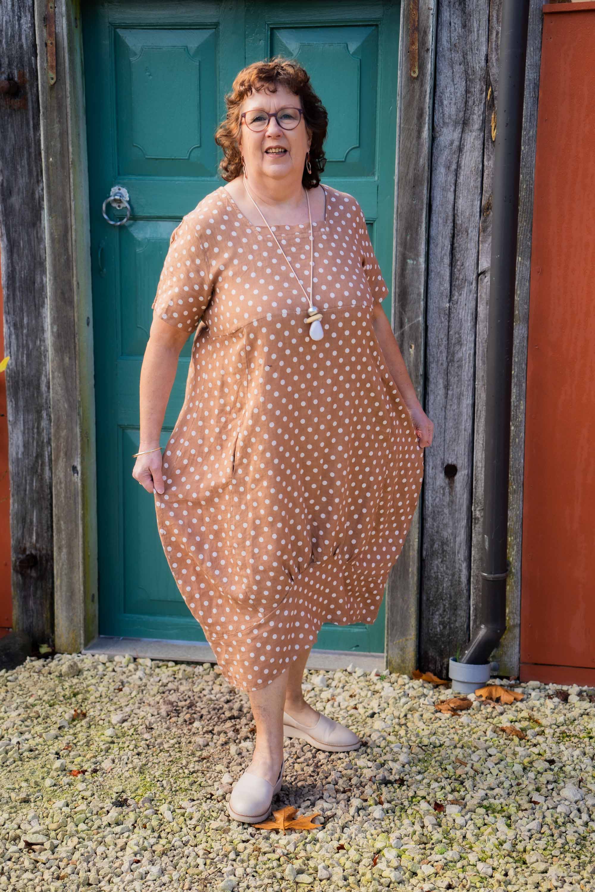 The Polka Dot Maxi Dress in 100% linen is a dream to wear, especially for the fuller figure. It features a stylish square neckline and short set-in sleeves, with a fitted yoke that flatters the bust. The skirt is designed with three front panels and a full back, creating a beautiful flowing cocoon shape. Side pockets are seamlessly integrated into the front panels for added convenience. The unique skirt design is pulled together at the bottom with a shaped panel, deeper in the center than the sides, embodying the chic "Lagenlook" style. This dress is both flattering and comfortable, making it an ideal choice for any occasion. We have teamed this gorgeous style with one of our Linen Duster Coats in Chocolate.