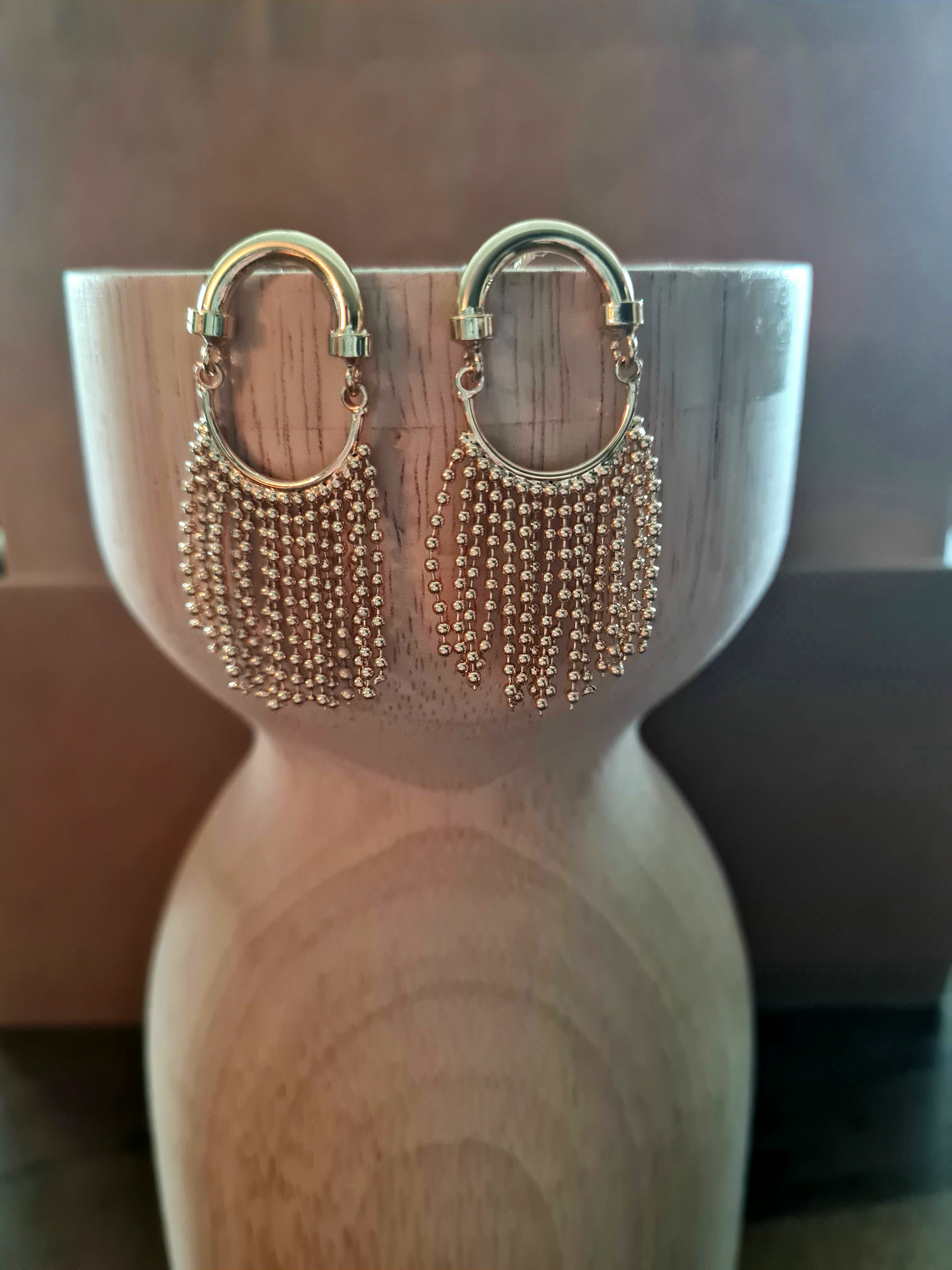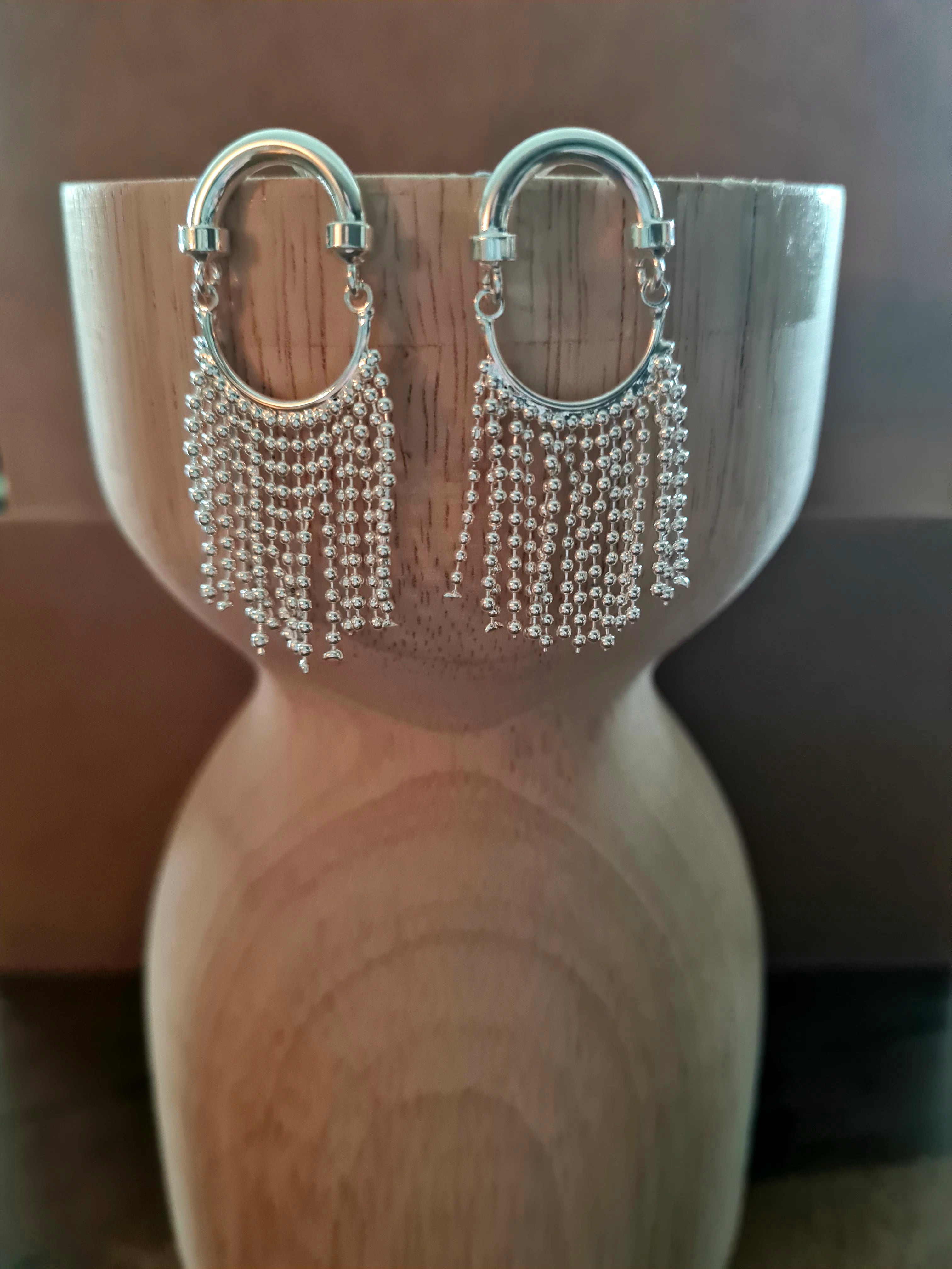 Bold yet refined, these substantial hoop earrings offer a striking blend of classic shape and contemporary flair. Available in both radiant gold and sleek silver finishes, each hoop features a secure post and is adorned with a dramatic 2cm cascade of 16 delicate mesh-style chain strands. The result is a fluid, textural statement that moves beautifully and catches the light from every angle. A unique and versatile piece that adds standout style to both everyday outfits and special occasions.