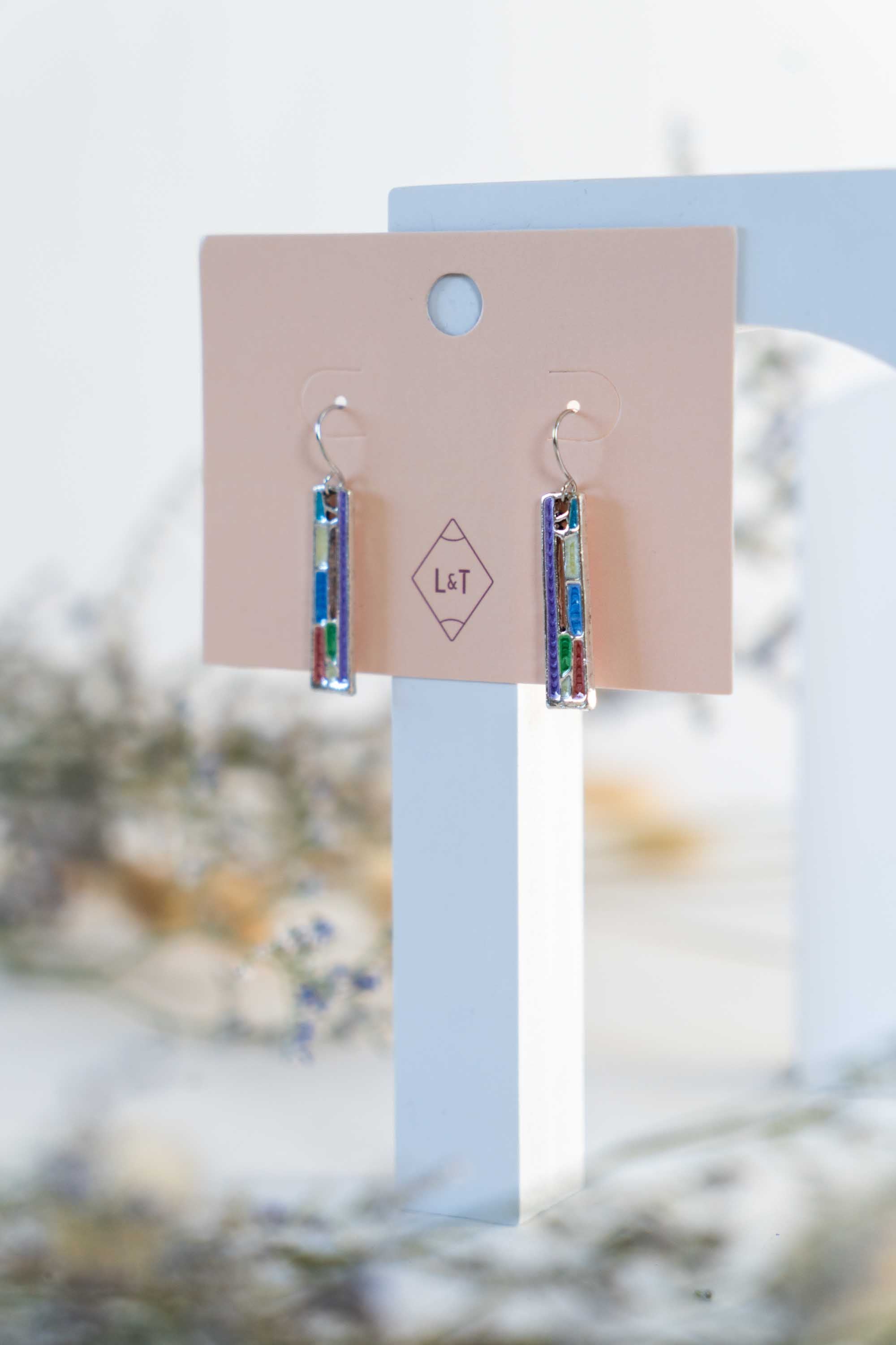 These thin silver metal drops feature inlaid panels of vibrant colors - purple, blue, pink, green, and white. Perfect for someone who prefers a simple, flashy-free piece with a touch of elegance.