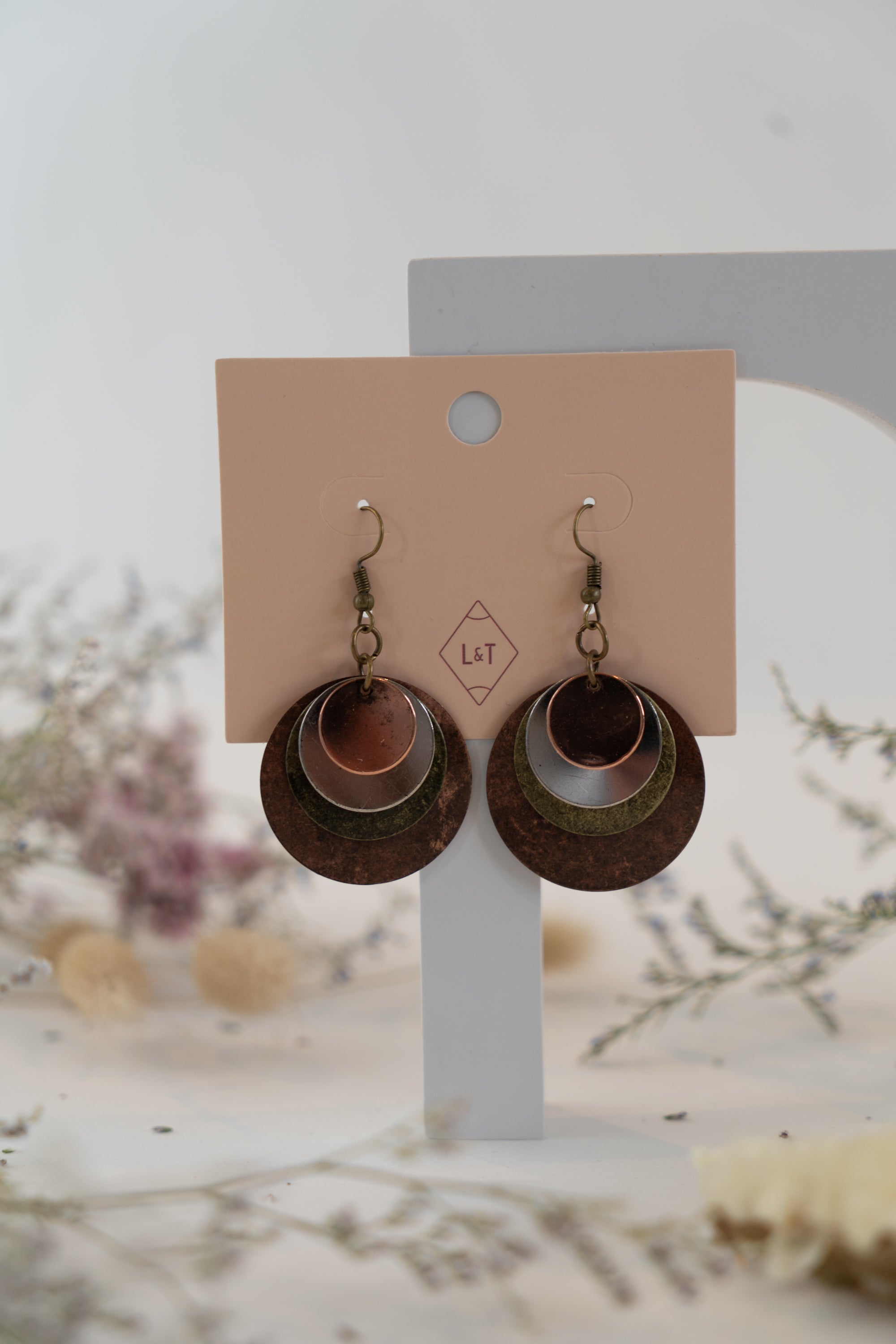 These earrings feature four layers of mixed metal discs in bronze, copper, and silver, creating a rich, earthy blend of tones. The combination of metals adds depth and texture, making them a versatile and stylish choice for any outfit.