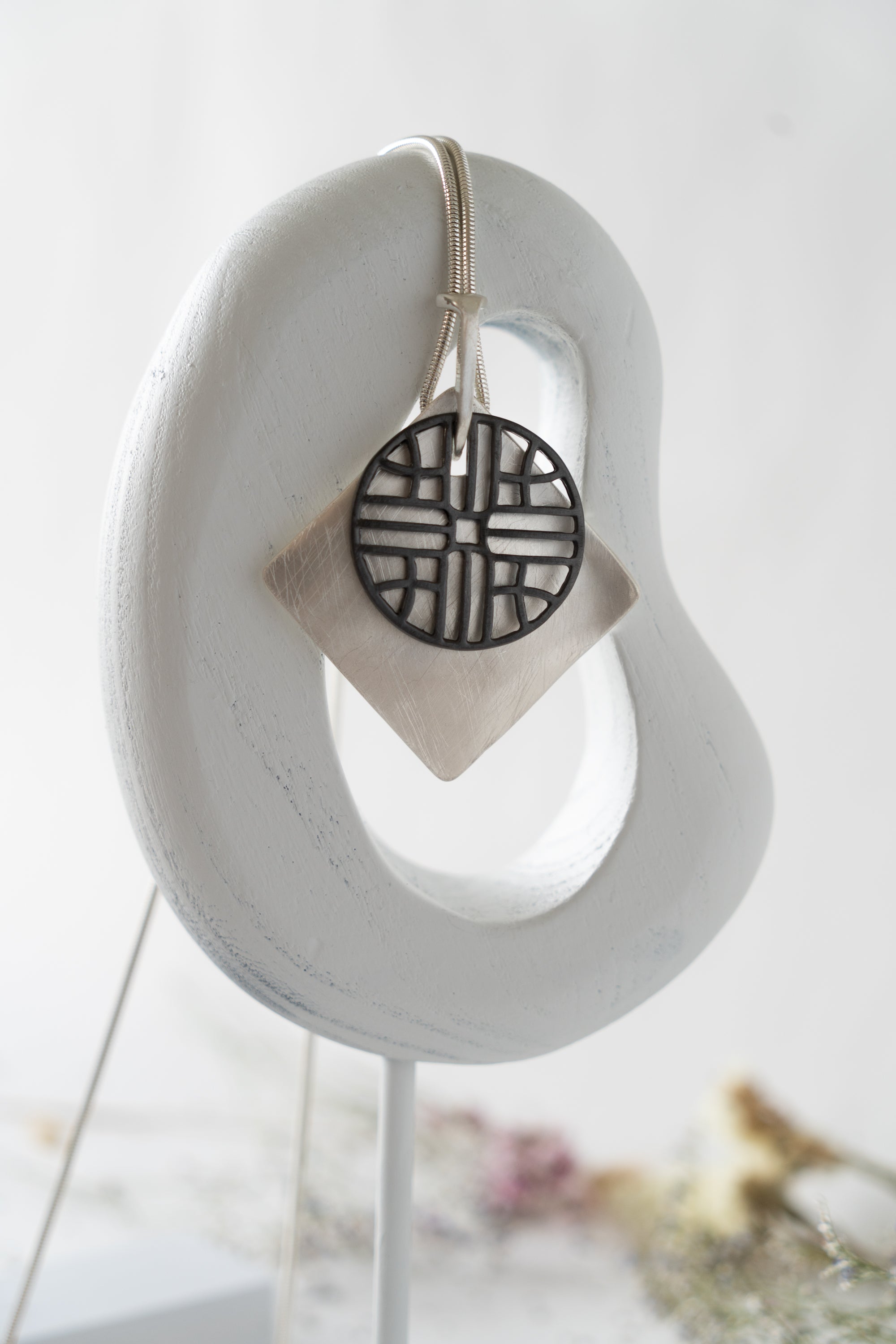 This necklace showcases a circular stamped grey metal disc layered over a square brushed silver metal plate, all suspended from a silver chain. It serves as a lovely feature piece, adding a modern touch to any outfit. The necklace is adjustable, with an option to extend the length by an additional 7 cm if needed.