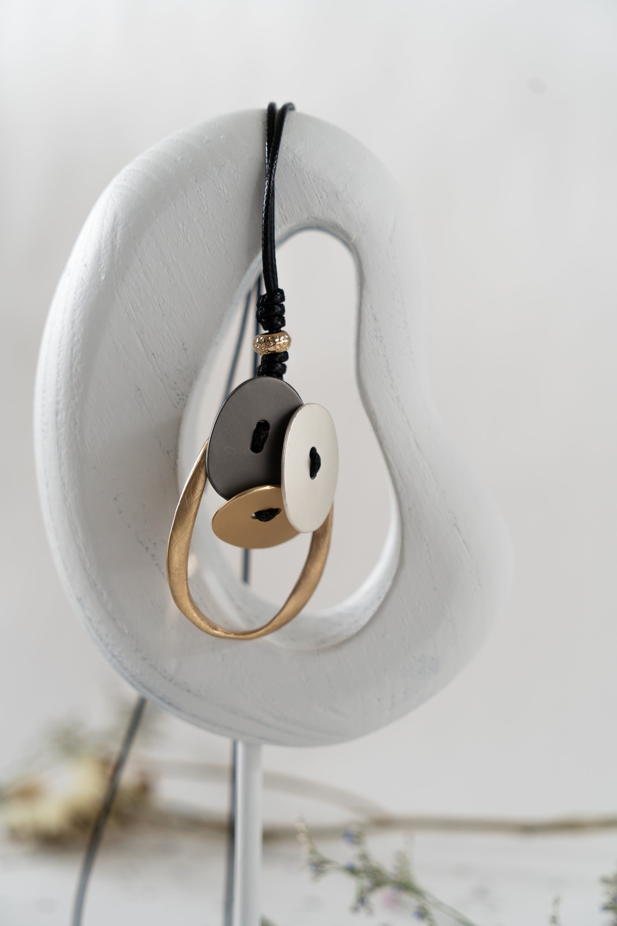 This distinctive piece is strung from a black leather cord, offering an adjustable extension of up to 7cm for a customizable fit. It features three metal buttons, each showcasing a unique mix of metal colors and textures, all artfully bound on top of a brushed gold metal ring. The combination of varied metallic finishes and the rich gold backdrop creates a striking contrast, making this accessory both bold and versatile.
