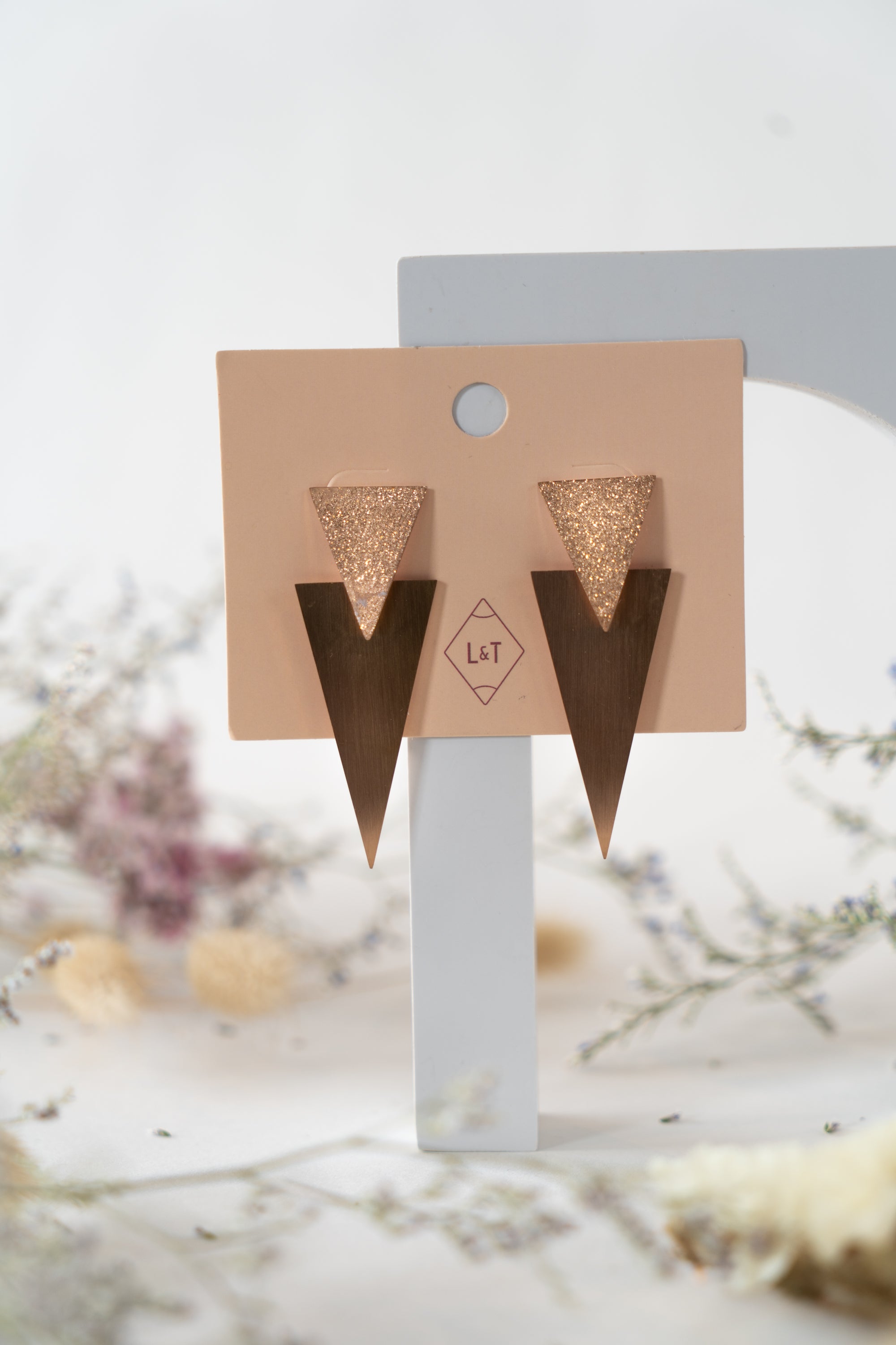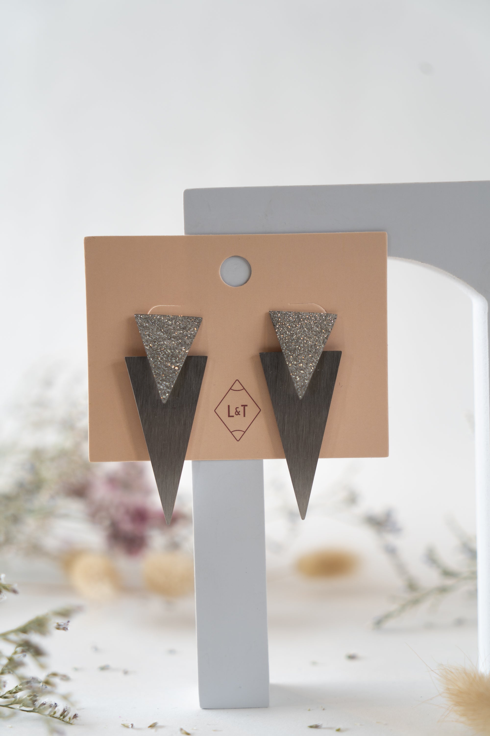 These striking metal triangle earrings feature a bold design with a larger triangle in a brushed finish layered beneath a smaller triangle in a frosted brushed finish. Their modern geometric style and eye-catching textures make them a fabulous standout choice for evening wear.