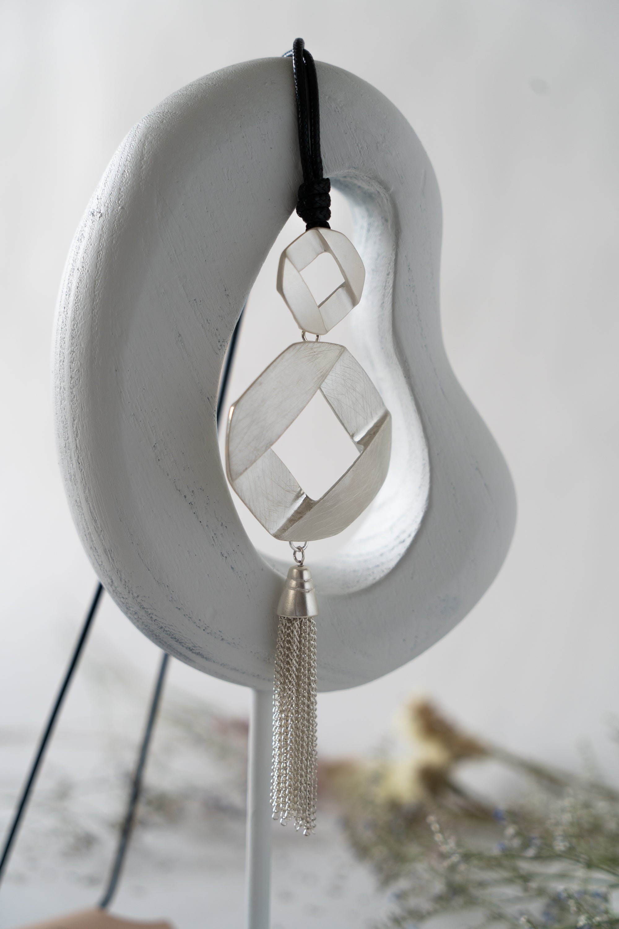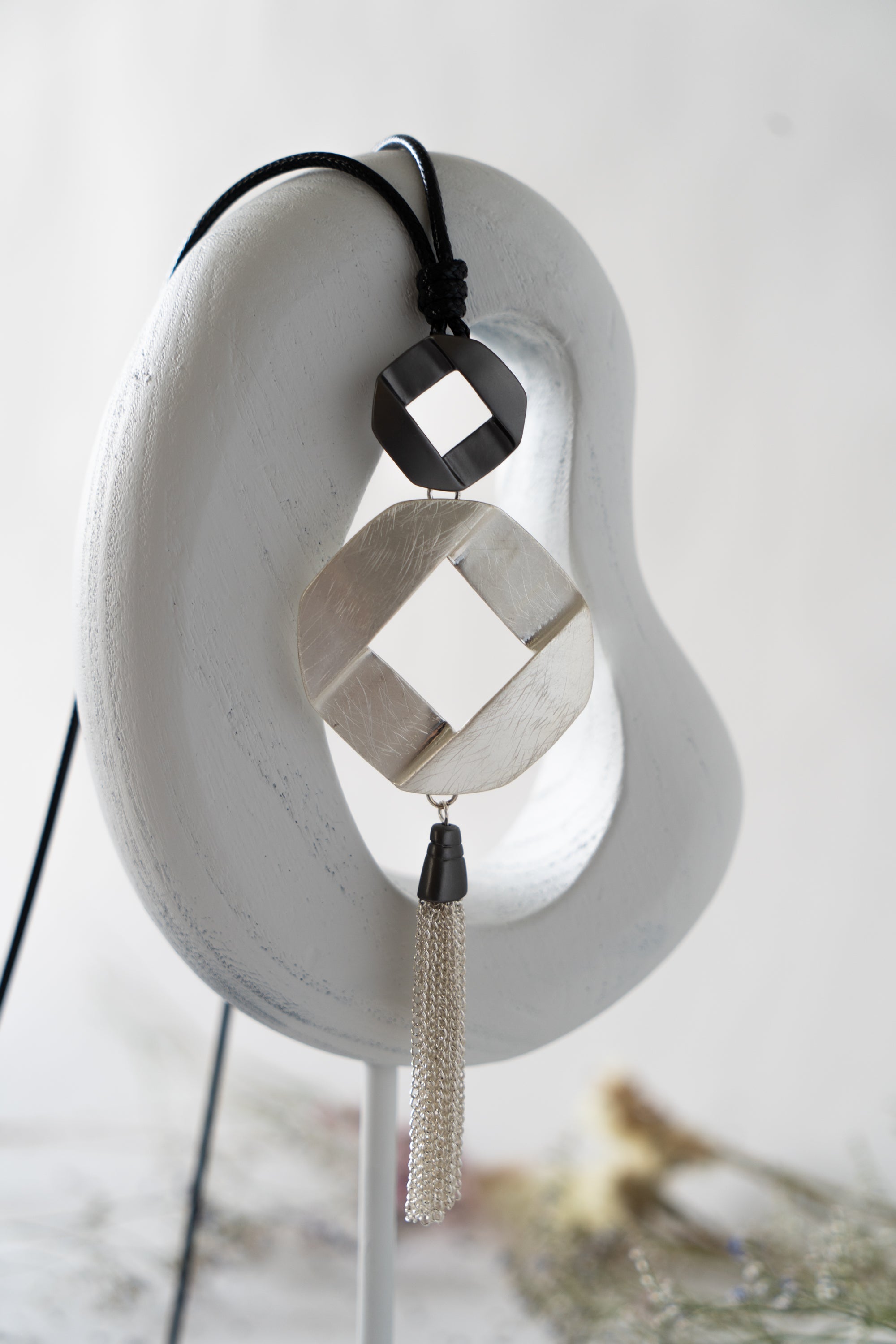 This elegant piece features both a small and a large, twisted metal square, with delicate tassels of chain cascading below them. The design offers two color options: one in all brushed silver for a sleek, uniform look, and another in a combination of brushed silver and matte finished grey metal for added depth and contrast. The interplay of textures and the flowing chains create a sophisticated and dynamic accessory.