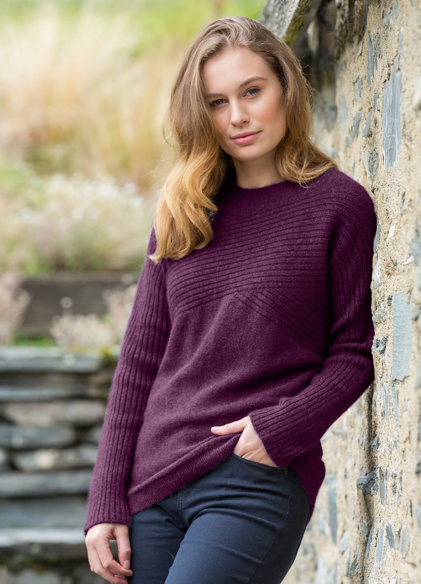 This jumper in a fitted style, relaxed wide neck with crossover rib detail on body and sleeves.