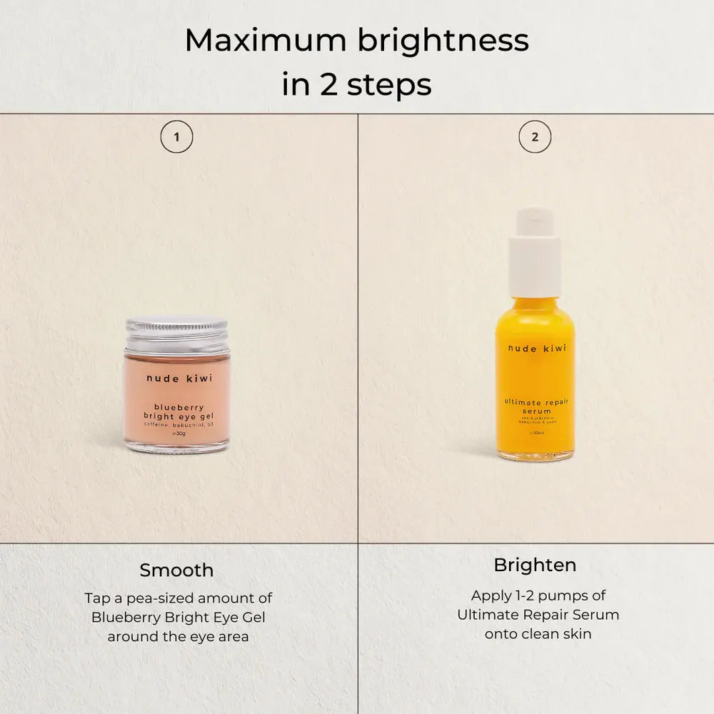 Blueberry Bright Eye Gel: Apply a small amount to under-eye area using your ring finger. Gently tap until absorbed. Use morning and night for best results.