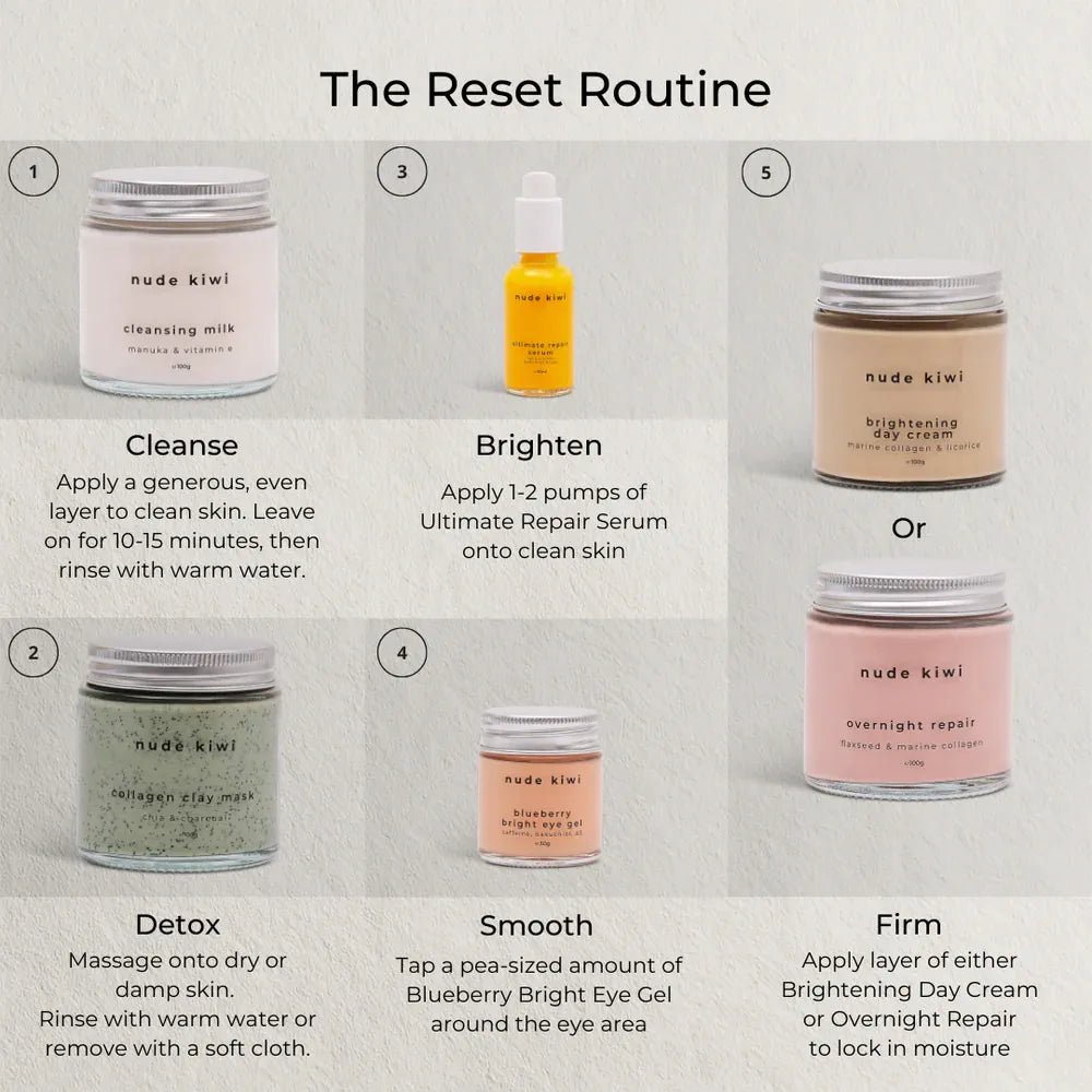 Overnight Repair: A rich overnight cream designed to deeply nourish and repair the skin barrier. Flaxseed and marine collagen help support overnight renewal while lavender and rose geranium oils soothe and calm. Wake up to hydrated, softer, and visibly refreshed skin.
