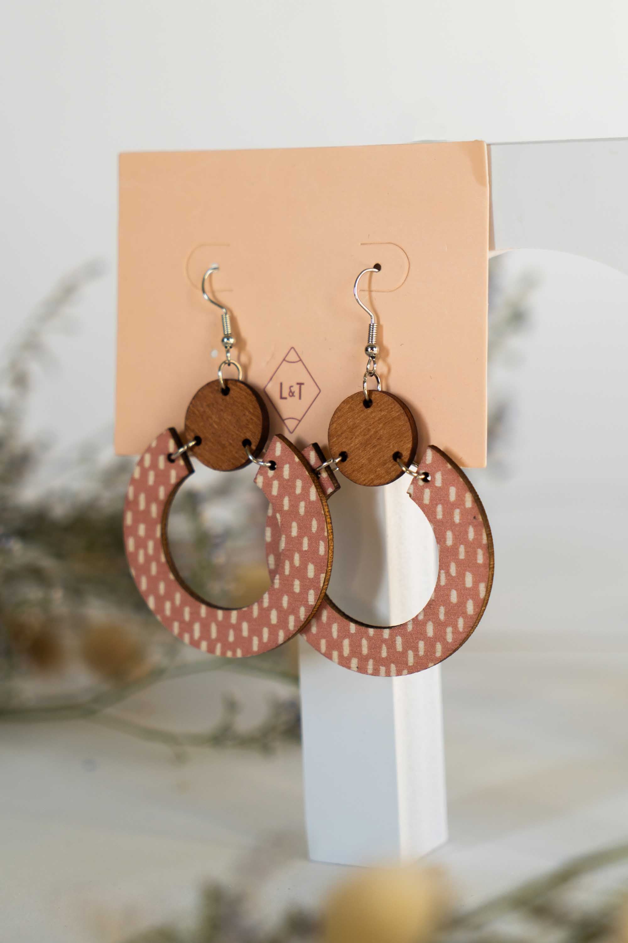 These gorgeous earrings are a real treat for adding a splash of color. Made of lightweight wood, they feature dusky pink rings with white dots and a wooden disc connector at the top. Available in four color options, these earrings are perfect for brightening up any outfit.