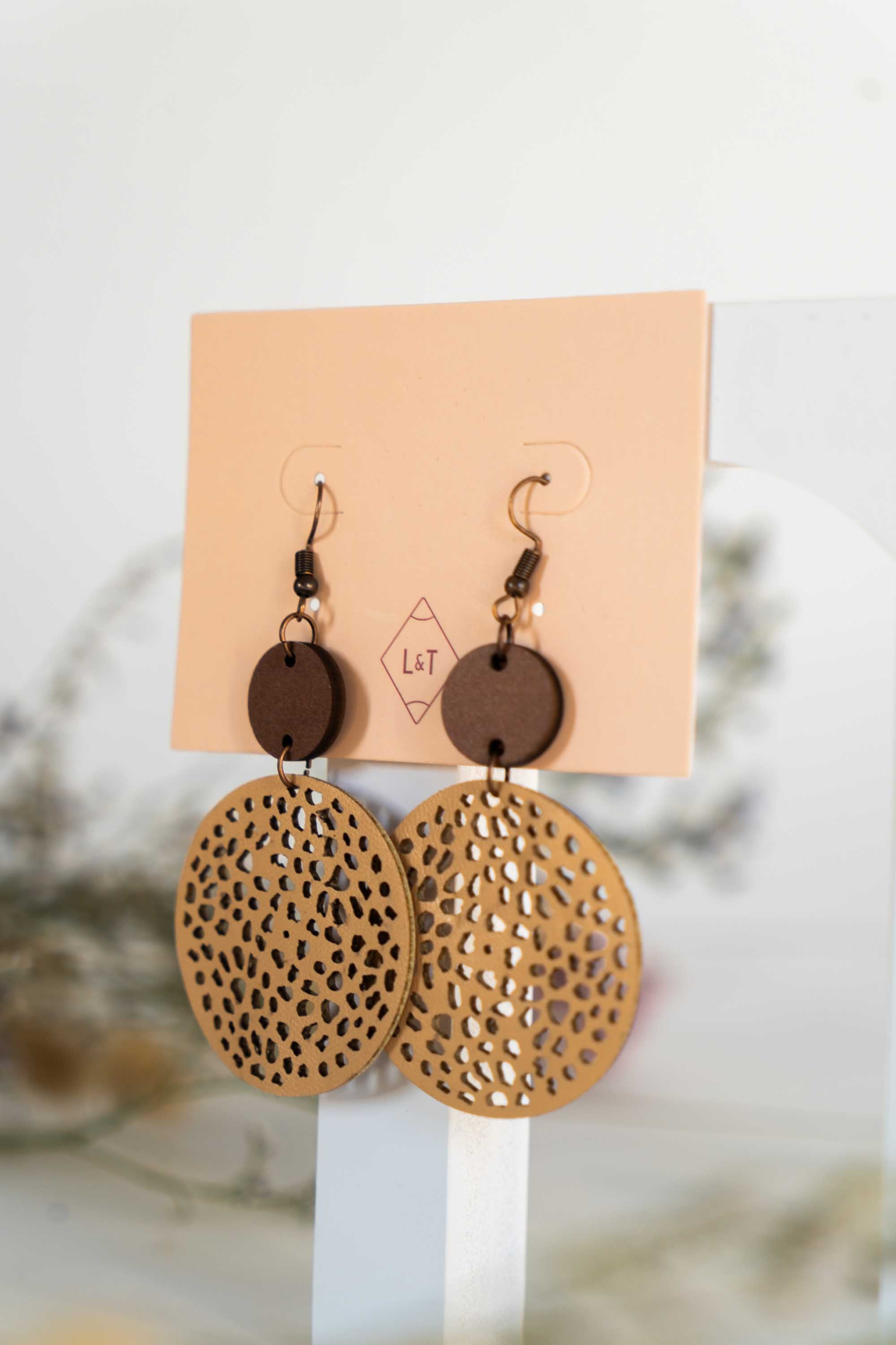 These earrings have a natural look that complements any outfit. They feature leather discs with hole-punched detail, paired with light wood circles above. Stylish and versatile, they are perfect for everyday wear.