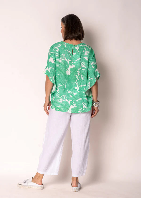 The Rennie Top in Capri Green is fresh and modern, designed to stand out with subtle elegance. It features a round neckline and a button opening at the back, offering a straight-through fit that is both relaxed and refined. Drop bell sleeves bring a soft, feminine touch, while the rounded hi-low hem adds gentle movement and shape.