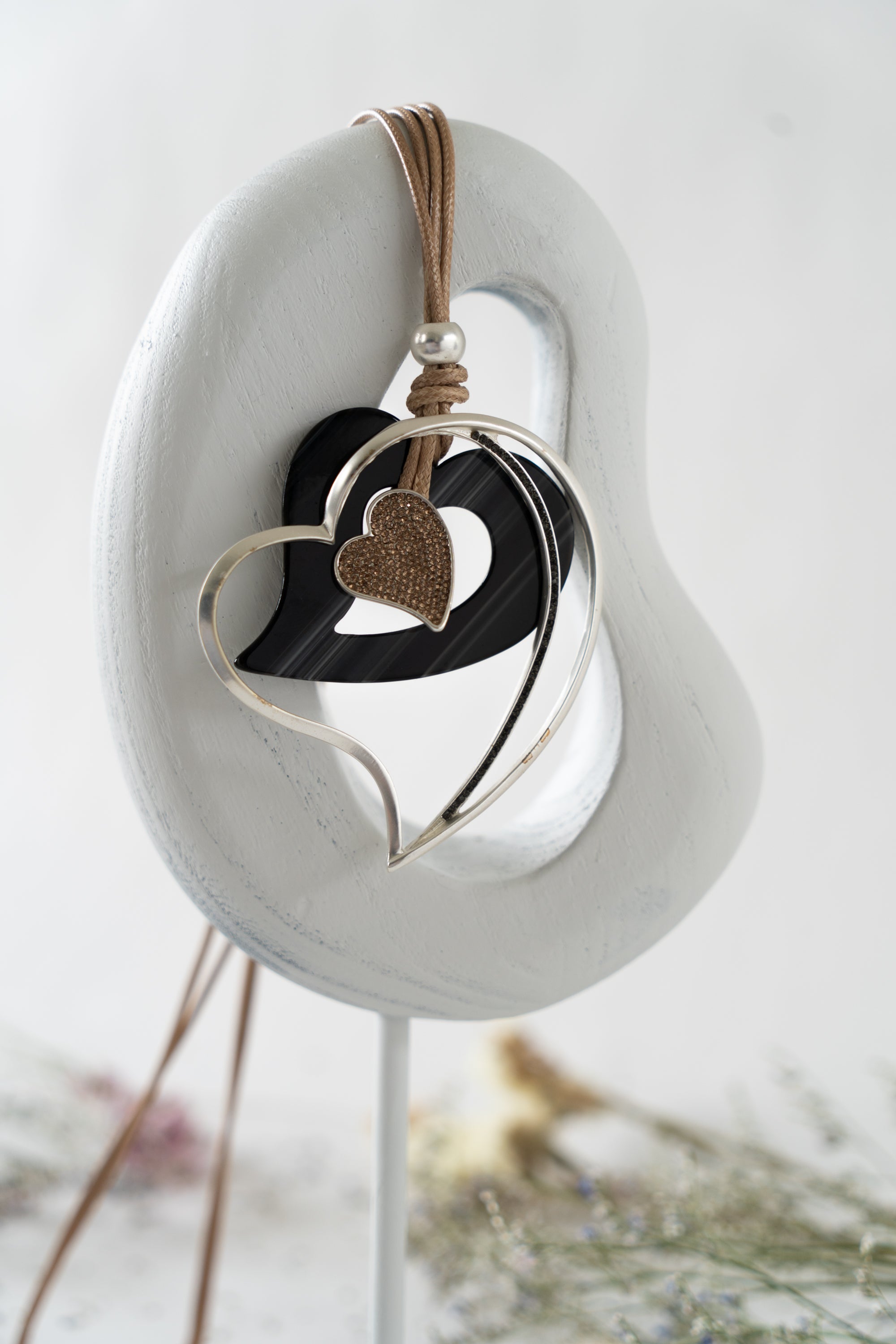 This unique statement piece features a textured silver heart frame with a striking black marble-colored resin heart shape within the center. Inside the heart frame is a smaller heart encrusted with crystals, adding a touch of sparkle and elegance. The entire pendant hangs from a double-strand beige leather cord, which includes an extension of up to 7cm for a customizable fit. This piece combines bold design with sophisticated details, making it a standout accessory for any occasion.