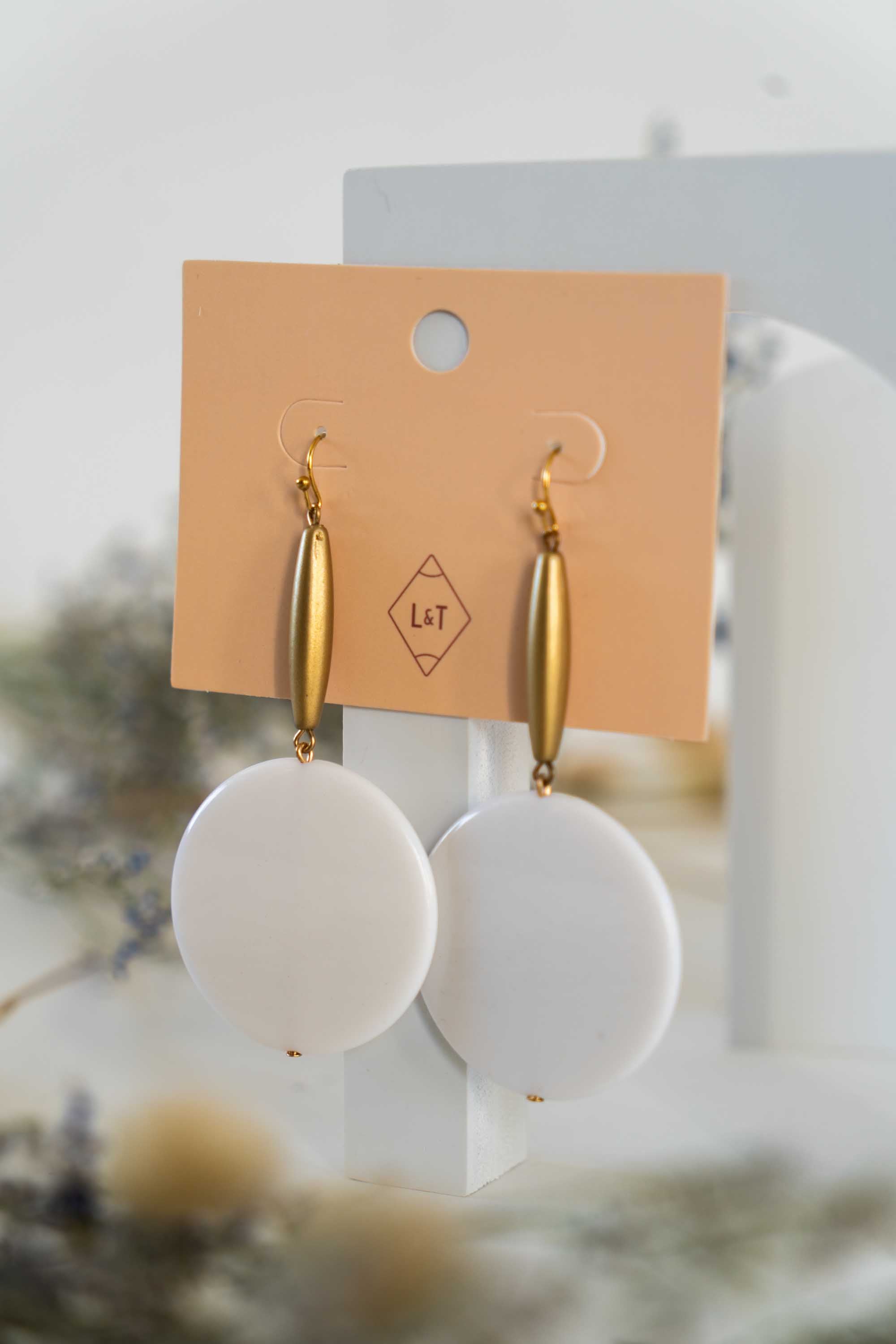 These earrings feature white resin discs hanging from a deep gold bar, creating a striking statement piece without relying on bold colors. With their considerable length, they are perfect for those who dare to make a stylish and sophisticated impression.