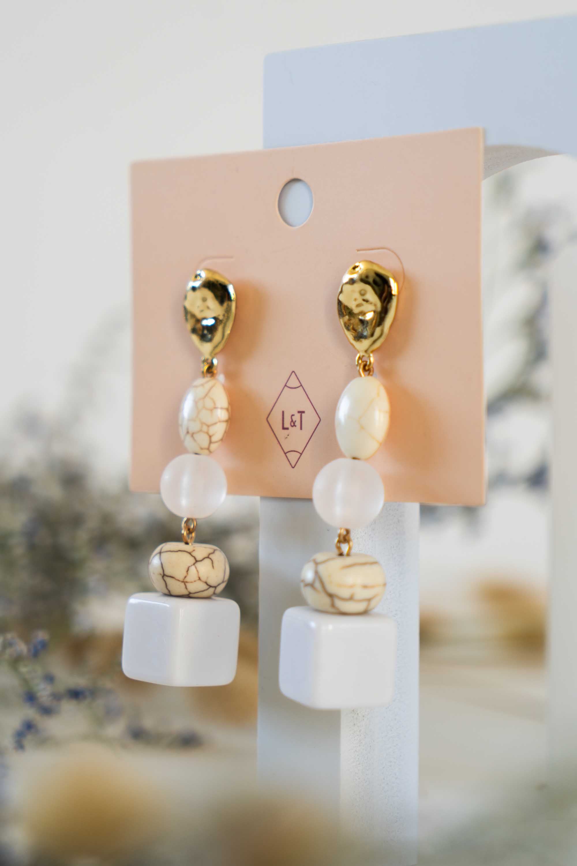 These earrings feature white stones and resin blocks hanging from a delightfully misshaped gold disc resembling a gold nugget. They make a striking statement piece without relying on bold colors. With their considerable length, they are perfect for those who dare to make a stylish and sophisticated impression.