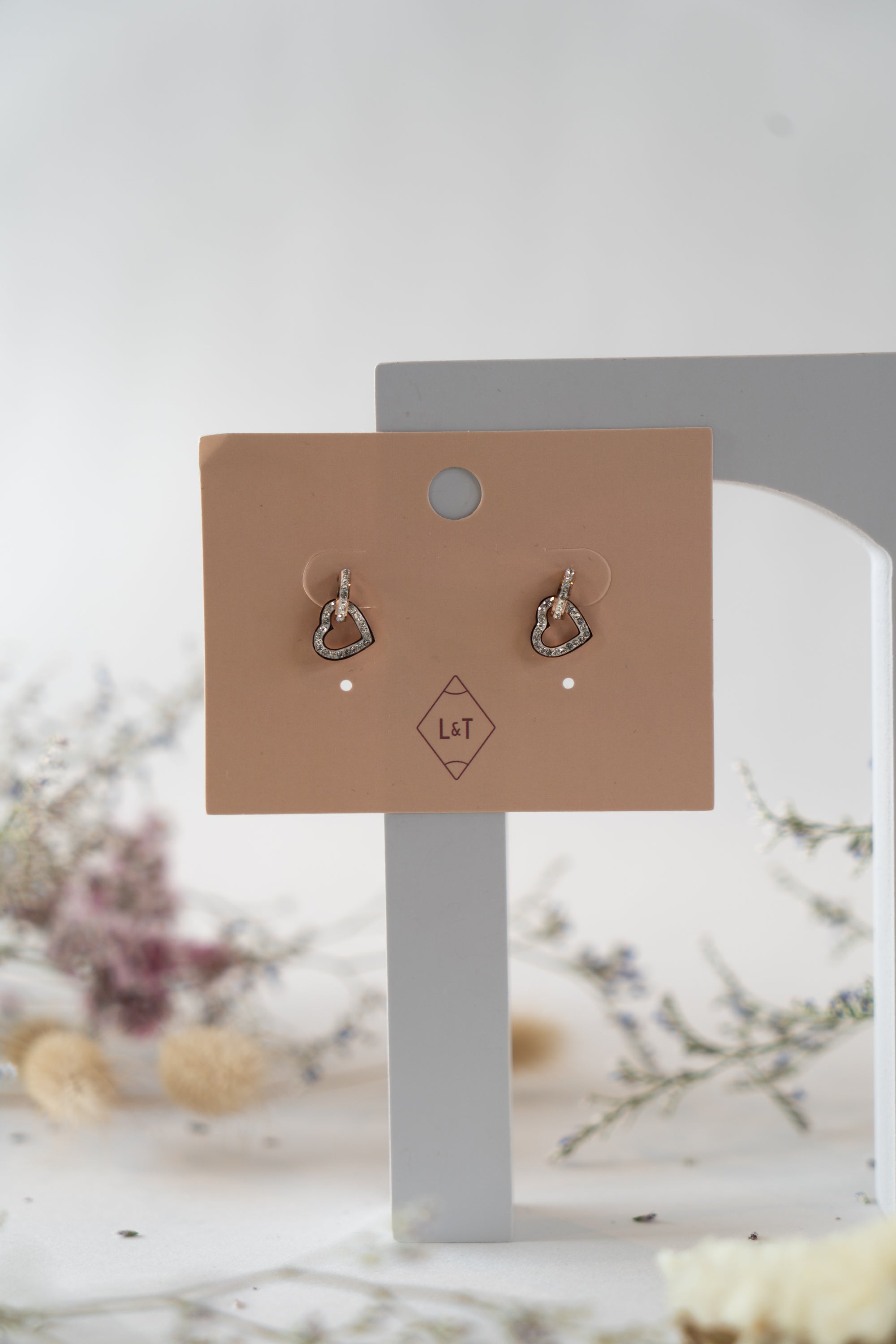 These earrings feature a stainless steel base plated in rose gold, with tiny black crystal-studded hoops. Dangling from each hoop is a charming heart, also studded with black crystals. Part of our signature range, these earrings offer a stylish combination of elegance and edge, perfect for adding a touch of sparkle to any look.