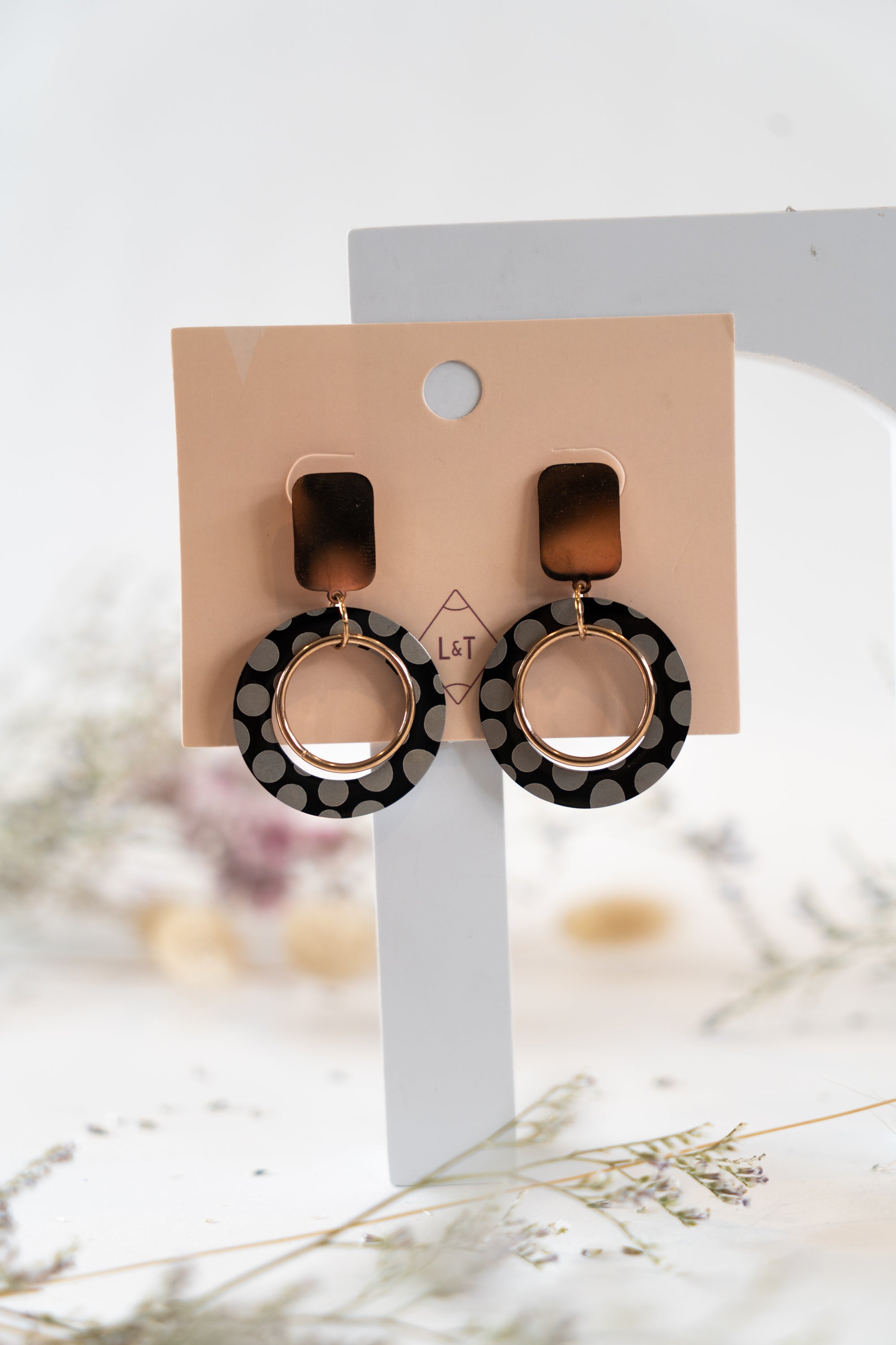 Part of our signature collection, these elegant earrings feature black metal circular rings adorned with rose gold dots and an overlay of a delicate rose gold ring. Their sleek and sophisticated design makes them the perfect accessory for elevating your little black dress.