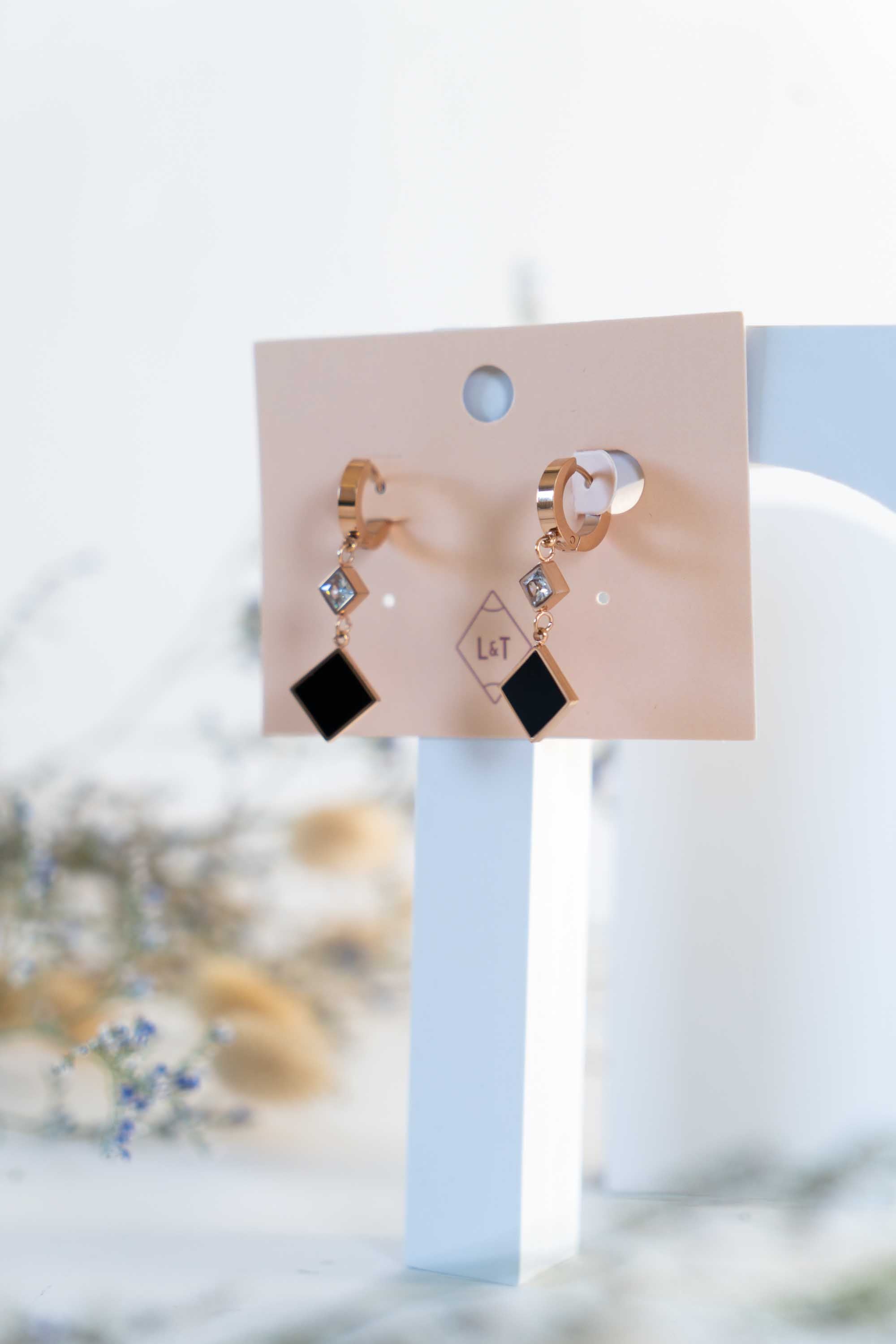 This delightful range features rose gold-plated pieces over stainless steel, exuding a delicate, feminine charm. These small hoops have a rectangular setting with an inlaid crystal, leading to a larger rectangle with an inlaid mother of pearl. This version makes a lovely bridal option. They are also available with crystal and black inlays. Explore the rest of the collection, available in Rose Gold or Rose Gold and Black.