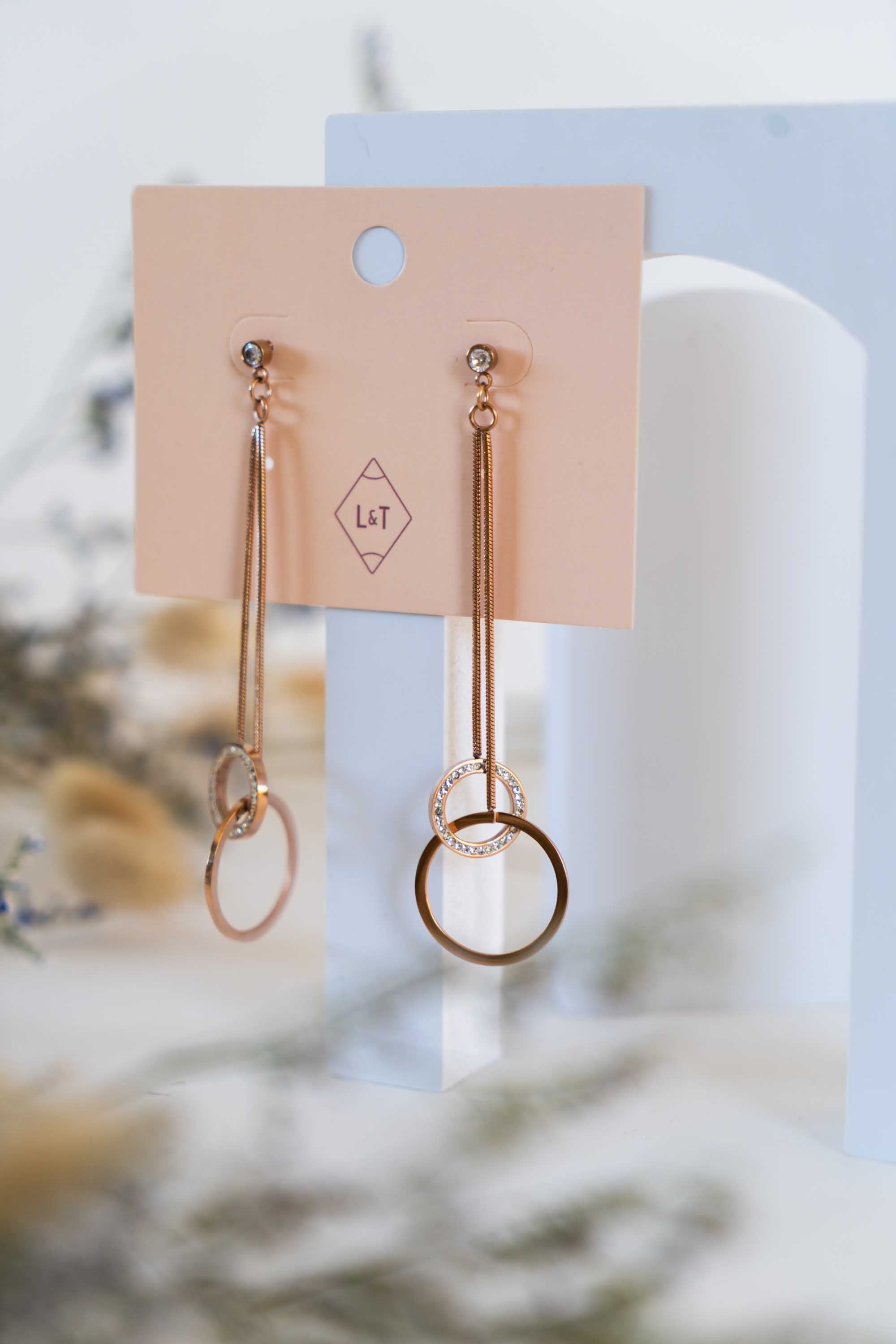 This delightful range features rose gold-plated pieces over stainless steel, exuding a delicate, feminine charm. These thread-like dangles are adorned with a crystal stud at the post, a delicate ring and a second, crystal-encrusted ring at the bottom. Explore the rest of this beautiful collection, available in Rose Gold or Rose Gold and Black.