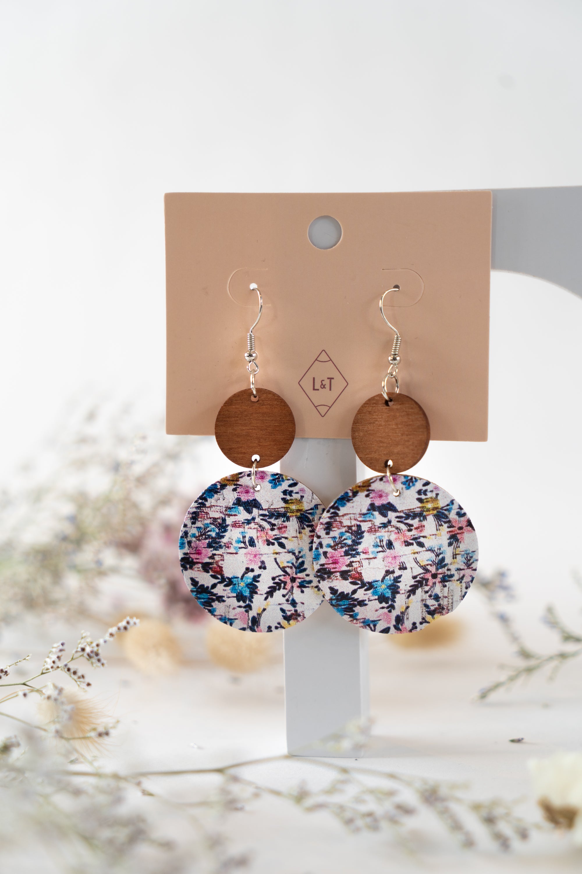 These charming earrings showcase a circular cork base with a delicate white background, adorned with soft pink, blue, and subtle mustard-colored flowers. Topped with a lightweight wooden disc, they combine natural textures with a pop of color. Their versatile palette makes them a stylish and adaptable accessory for any outfit in your wardrobe.