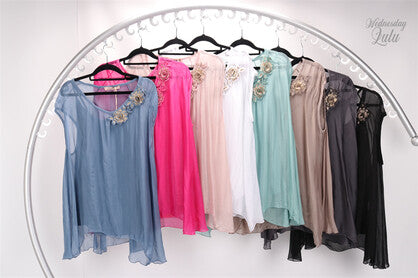 This elegant silk sleeveless top features a delicate outer layer with a graceful silhouette, complemented by a knit camisole for added comfort and coverage. A charming floral appliqué accents one side of the neckline, adding a touch of feminine sophistication. Pair it effortlessly with our taupe silk longline pants for a refined, coordinated look that's perfect for any evening occasion.