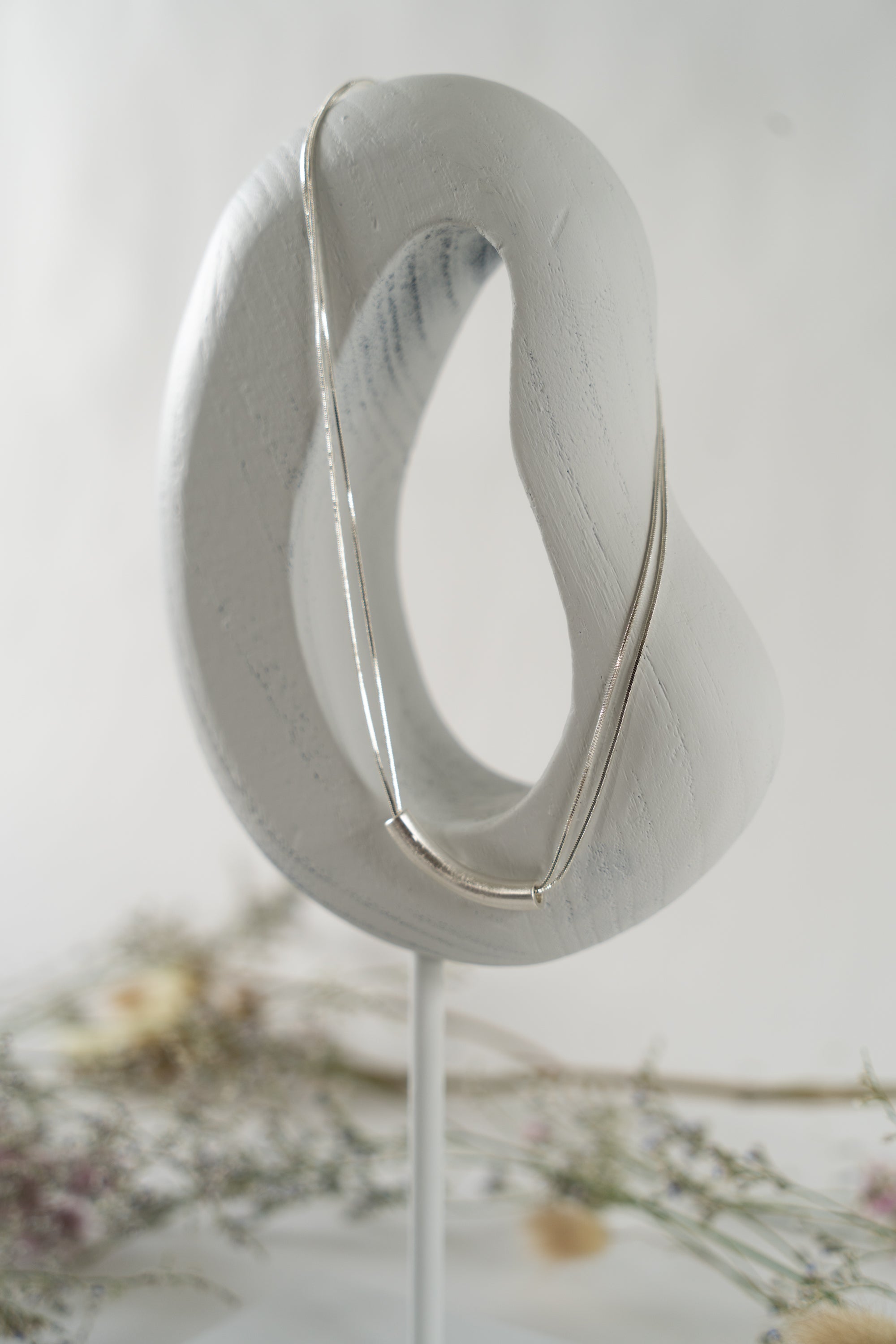 This delicate necklace features a double silver chain with a hollow matte silver bar at the base. It sits short against the neck, making it most suitable for a petite person or as a thoughtful gift for a teenager.