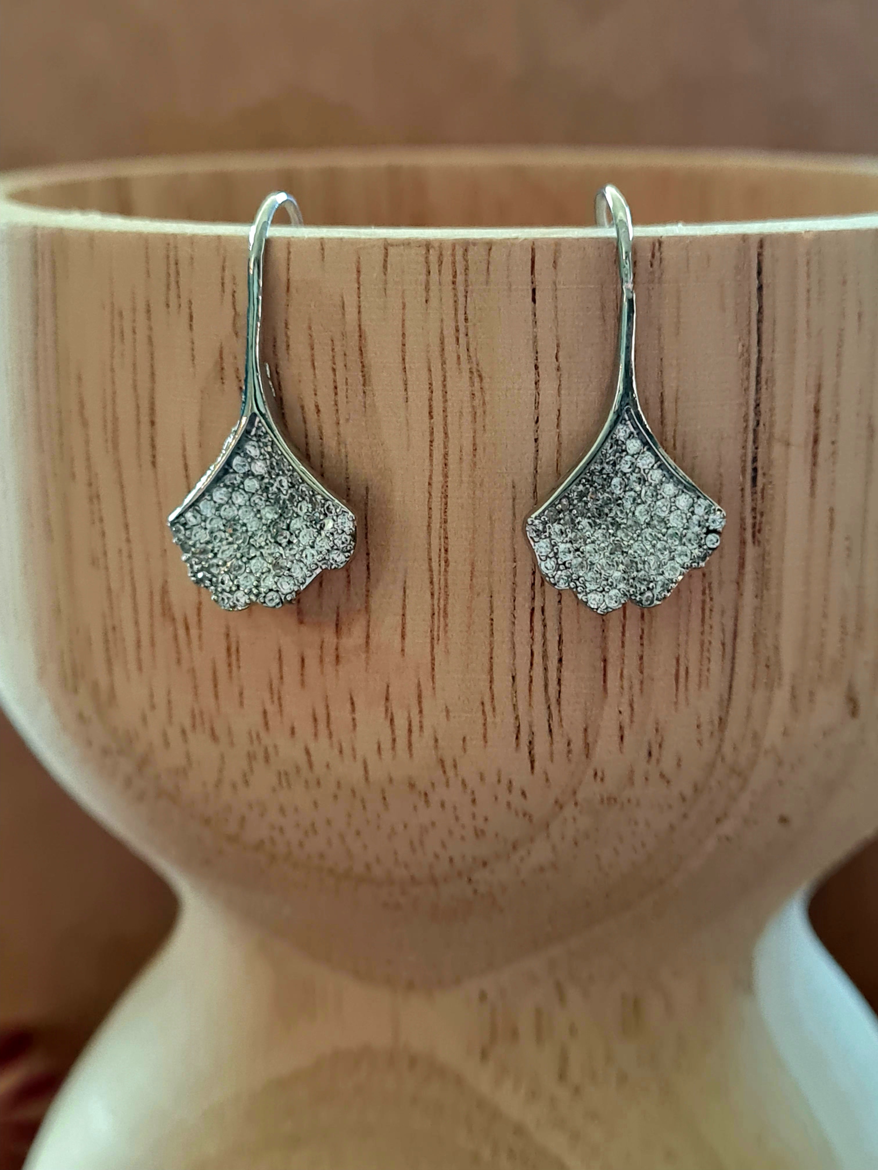 Crafted on a sterling silver base, these delicate fan-shaped earrings feature softly scalloped edges for a refined, feminine silhouette. Each fan shape is encased in fine shimmering crystals, adding just the right amount of sparkle. Understated yet elegant, they’re a versatile choice for weddings, formal events, or elevating everyday style with a touch of grace.