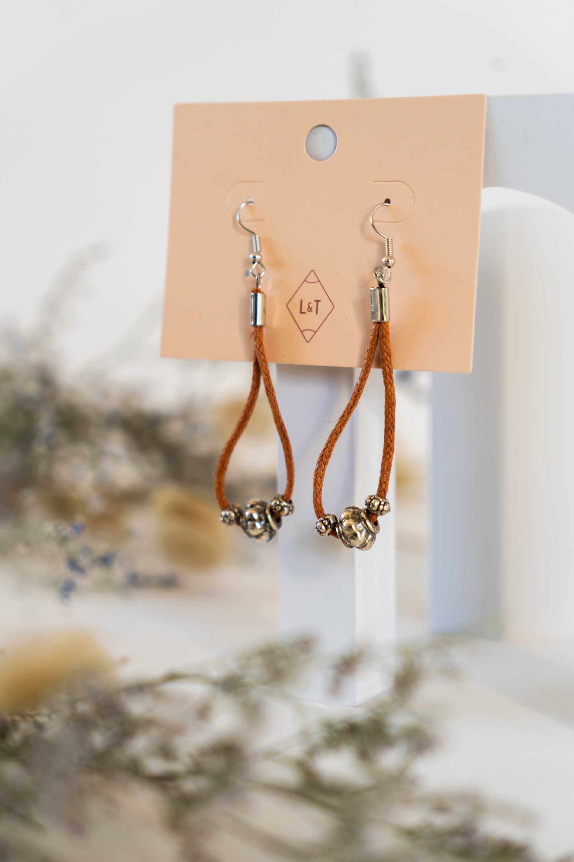 These long earrings feature silver beads elegantly strung onto the bottom of a leather cord, creating a unique and lightweight accessory. Perfect for everyday wear, they add a touch of ethnic charm to any outfit. The combination of sleek silver and natural leather offers a blend of modern and rustic appeal, making these earrings a versatile and stylish addition to your jewelry collection.