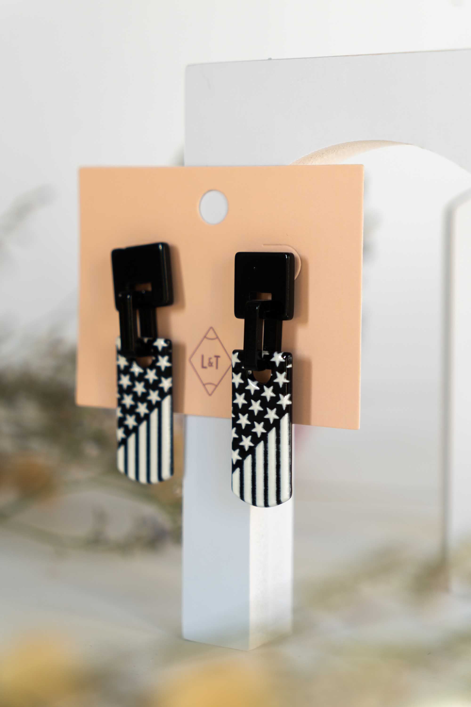 These earrings feature square black resin tops holding rectangular bars adorned with black and white stars and stripes. The bold design and contrasting patterns make them a striking accessory, perfect for adding a touch of modern flair to any outfit.