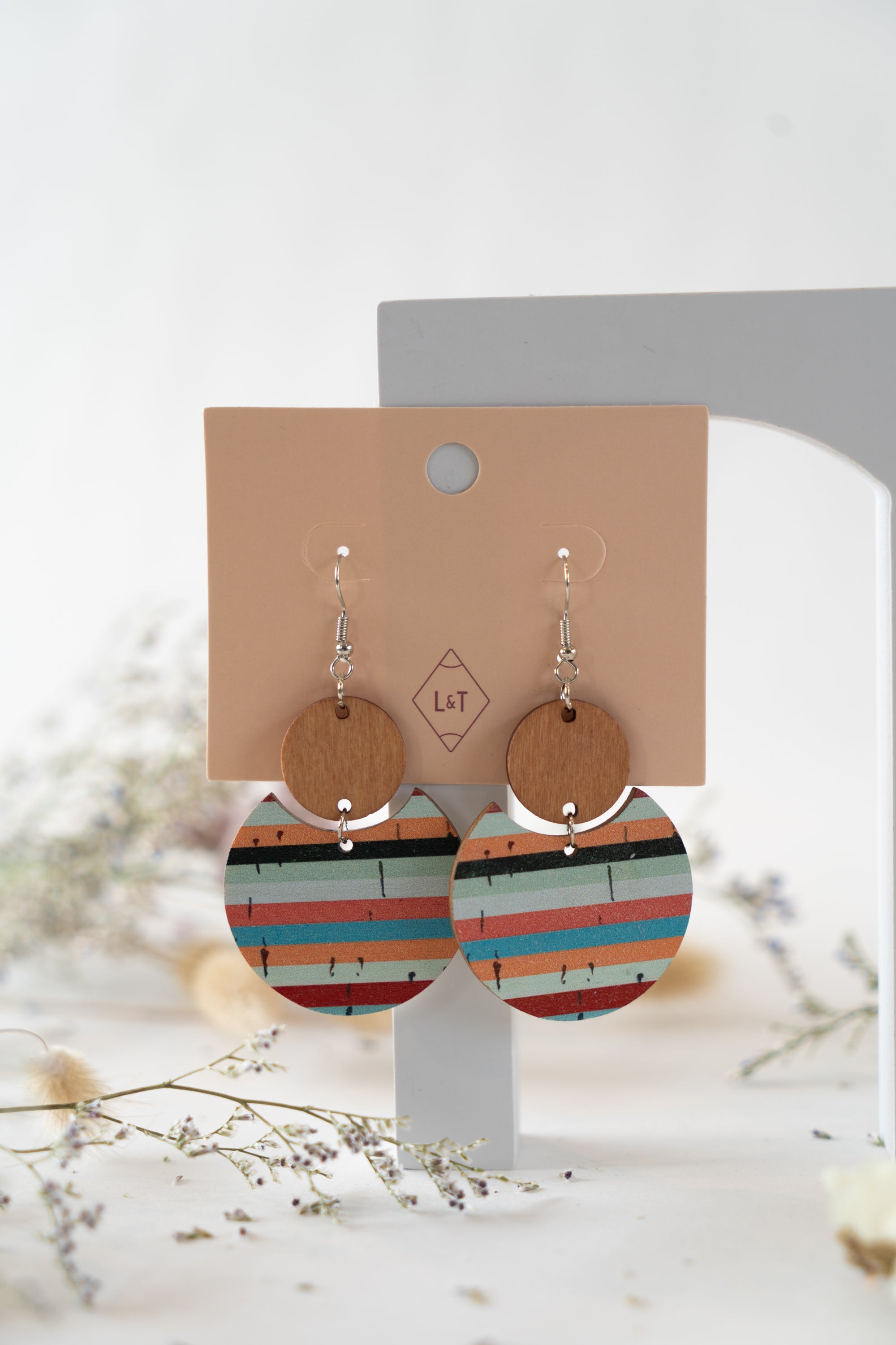 These earrings feature a lightweight wood crescent base striped in a mix of black, mint, blue and tan colors mainly. At the top they are held with a lightweight wooden disc. Their versatile color range makes them a perfect match for many items in your wardrobe.
