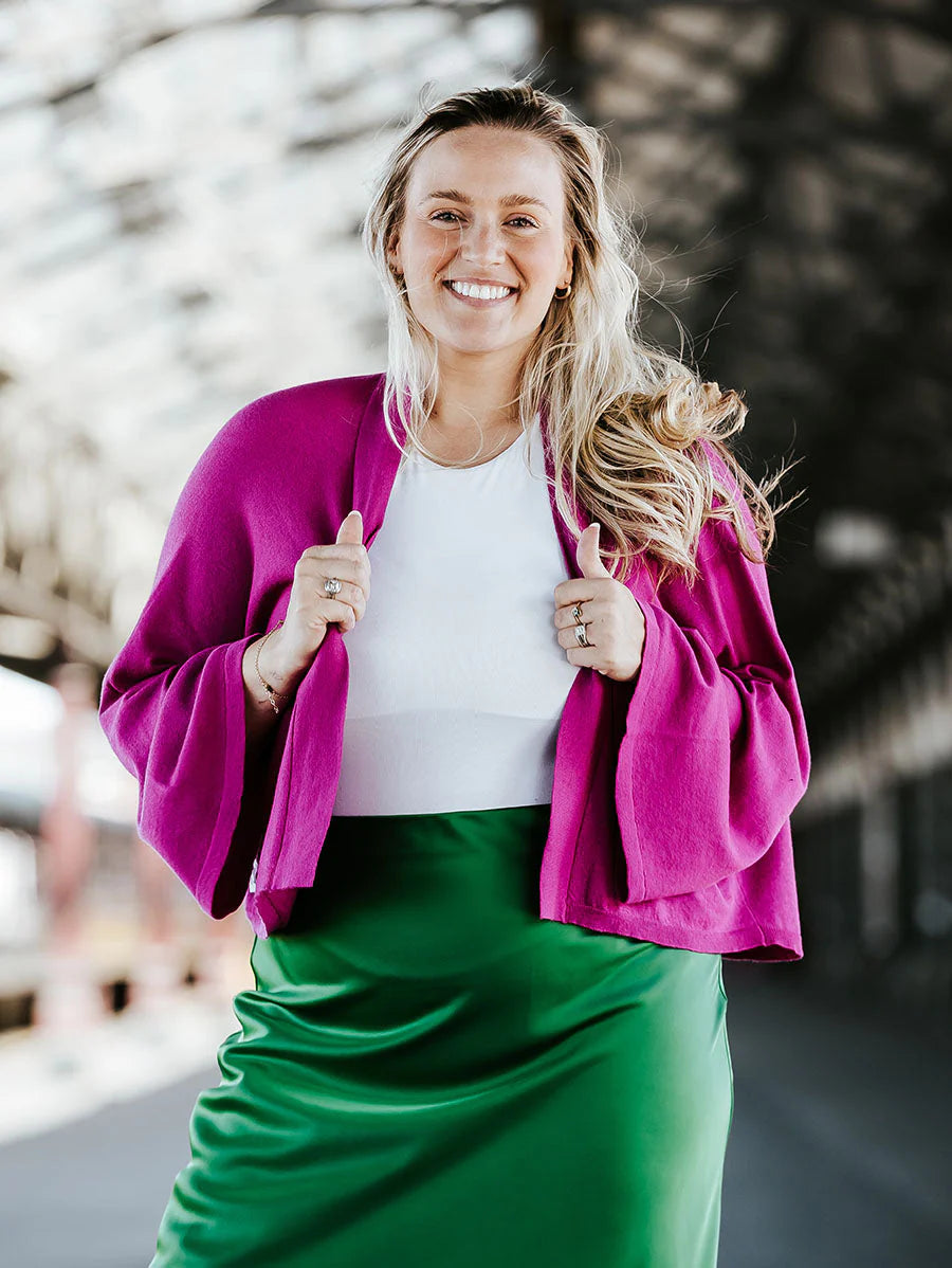 This luxurious kimono-style cardigan is crafted from a sumptuous cashmere blend, designed to drape effortlessly and flatter every figure. The free-size fit offers ultimate comfort, feeling light yet cozy against the skin. The structured drape detail at the back adds a sophisticated touch, elevating the style. With wide kimono sleeves, this versatile piece is perfect for layering over dresses, jeans, or skirts, making it a fabulous addition to any wardrobe for a chic and relaxed look. This really is a must have.