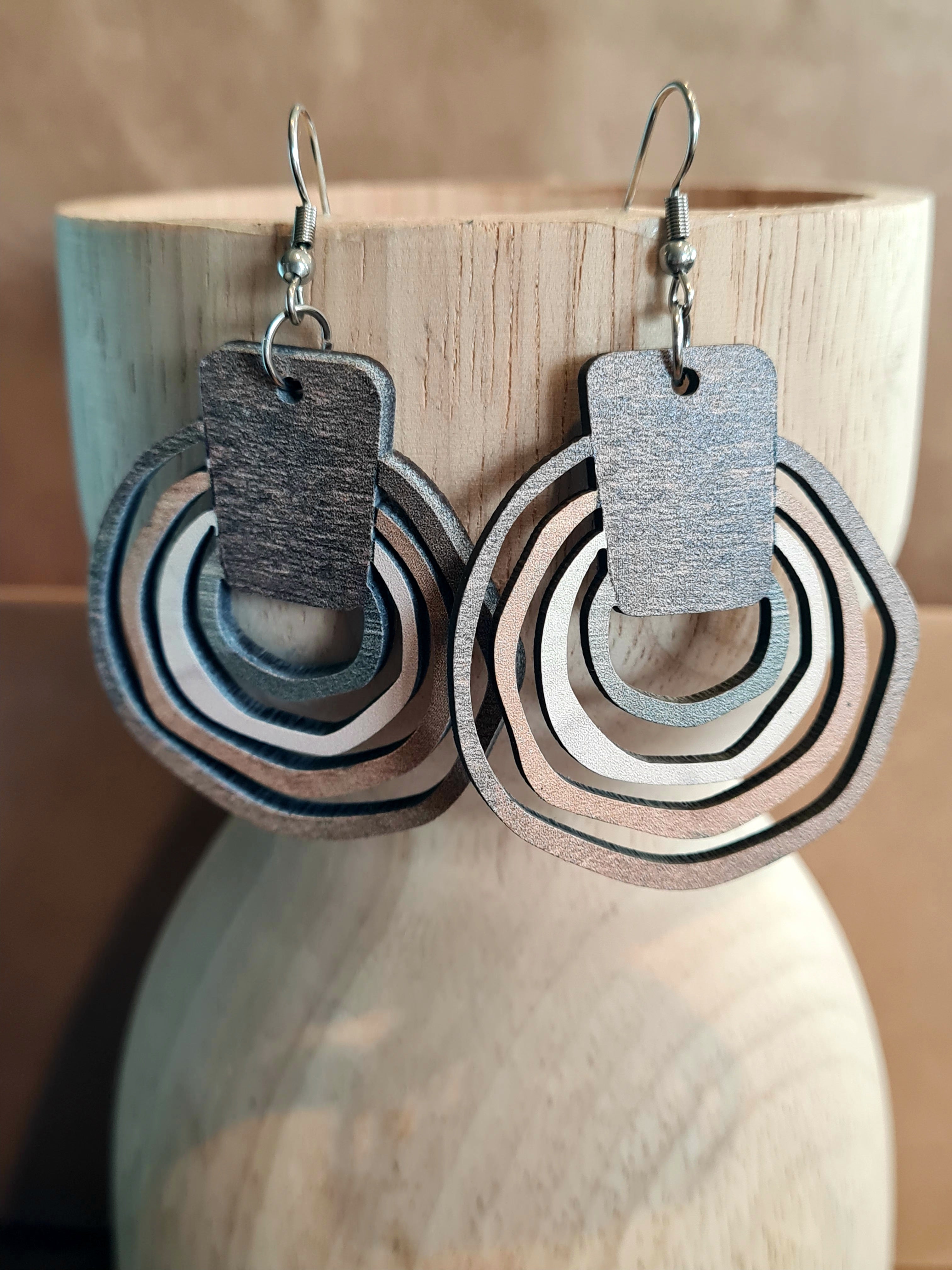 Carved from a single piece of wood, these earrings showcase a harmonious blend of three alternating natural shades, creating depth and richness in their design. At the centre sits a mid-toned rectangular block that anchors the piece and connects it elegantly to the ear. With their smooth finish and earthy palette, these earrings embody understated artistry and timeless wooden beauty.