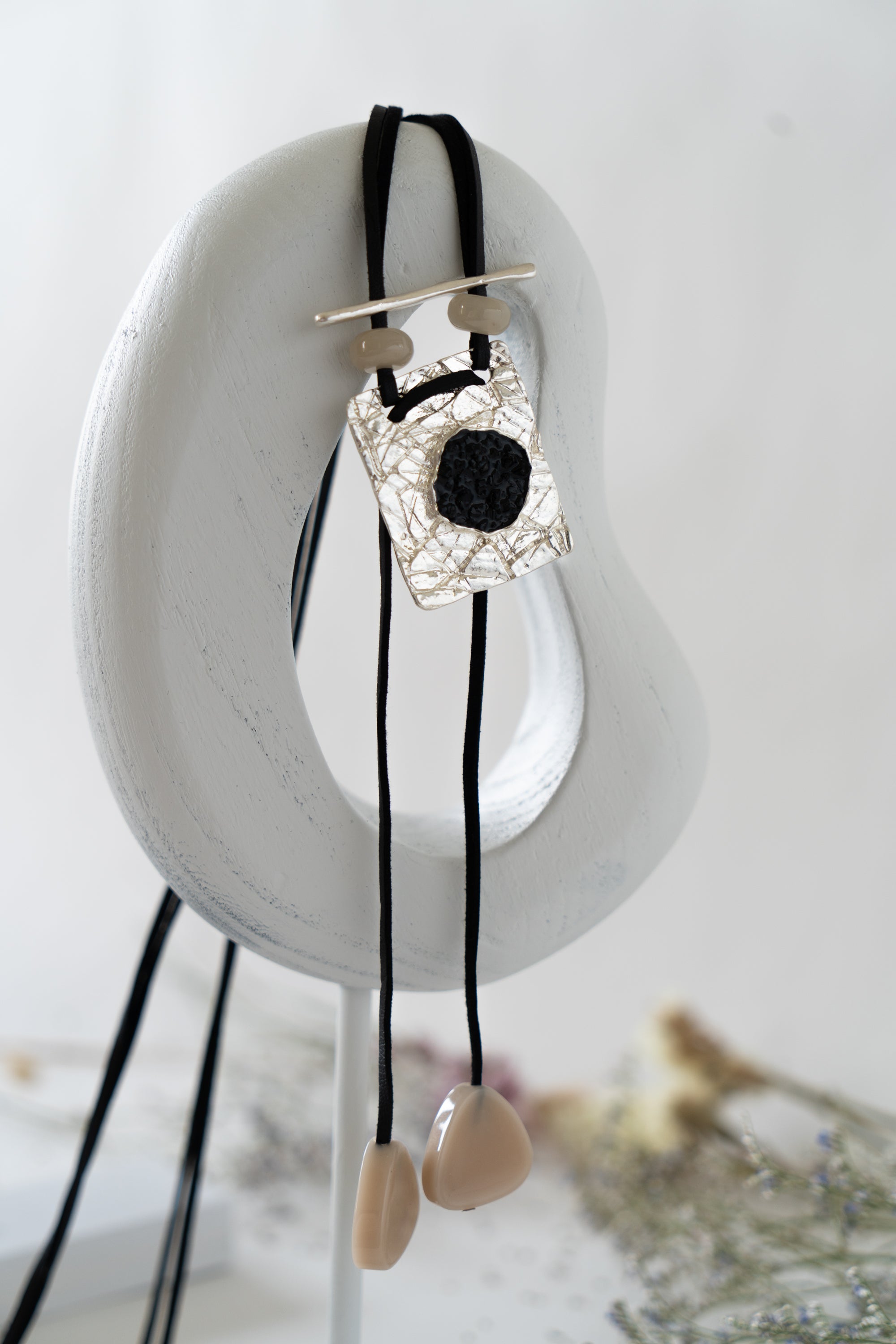 This unique piece showcases a textured silver disc adorned with striking black and neutral coloured resin accents. The pendant is suspended from a double leather thong cord, which elegantly transitions into single thread tassels that hang below. The combination of materials and the tassel detail add a touch of modern flair to this distinctive accessory, making it a standout addition to any collection.
