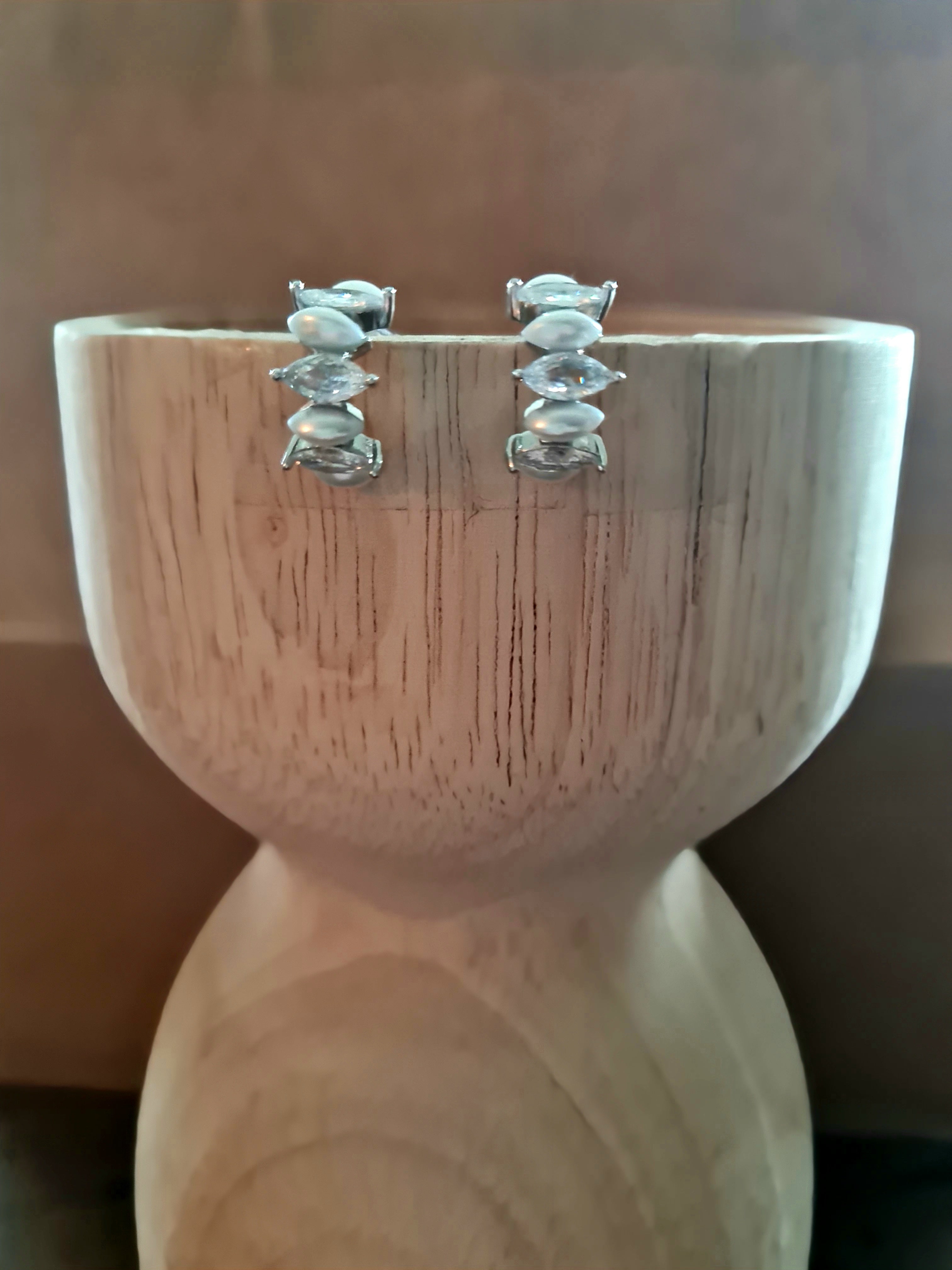 These delicate earrings feature a refined blend of marquise-cut crystals and oval pearls, artfully arranged to create a graceful silhouette. The cool grey hue of these minimalist style keepers adds a modern, understated shimmer, while the soft luster of the pearls brings a timeless elegance. Compact and lightweight, these tiny cuff-style earings are perfect for both everyday sophistication and special occasions. Secured with a classic stud backing, they offer a subtle yet striking statement.